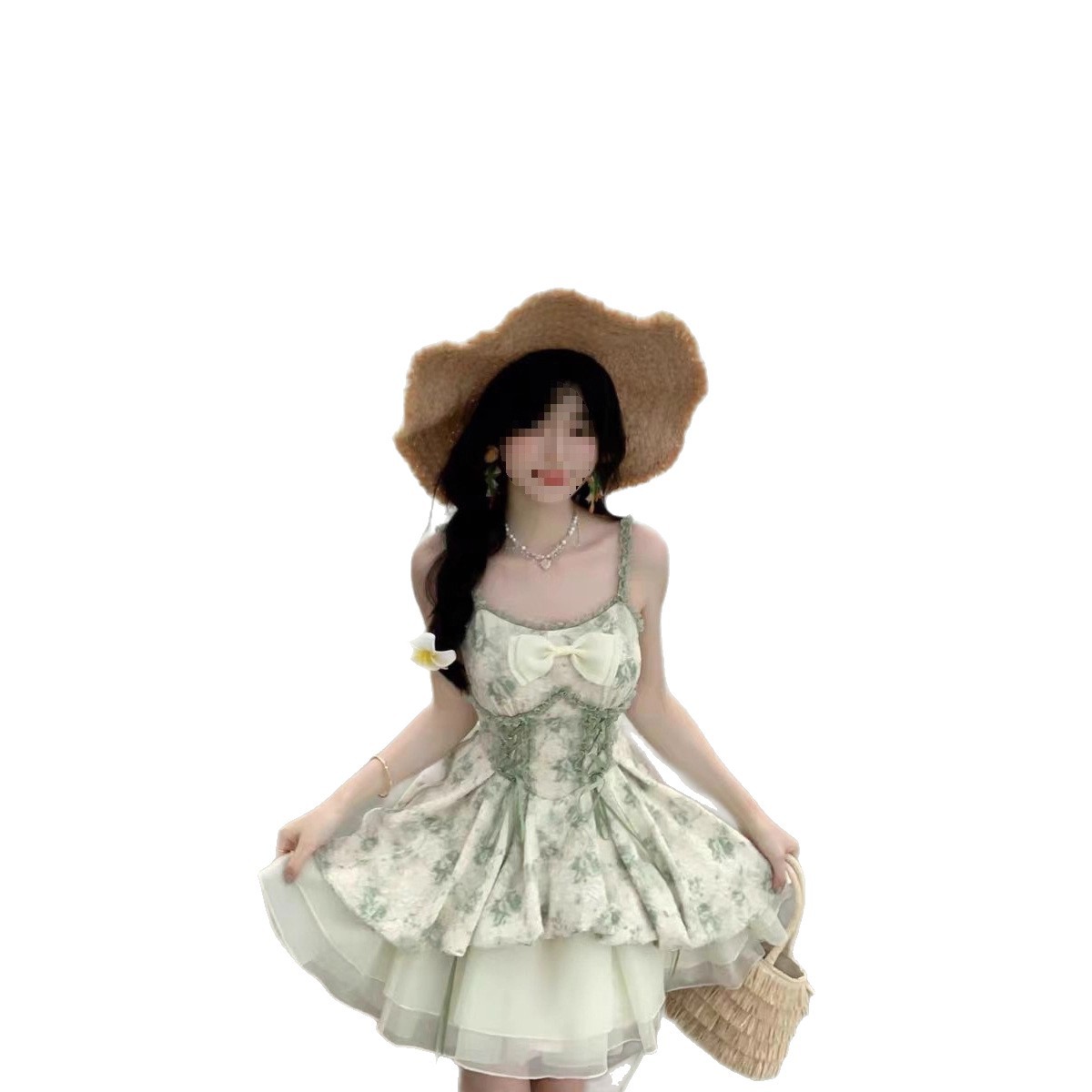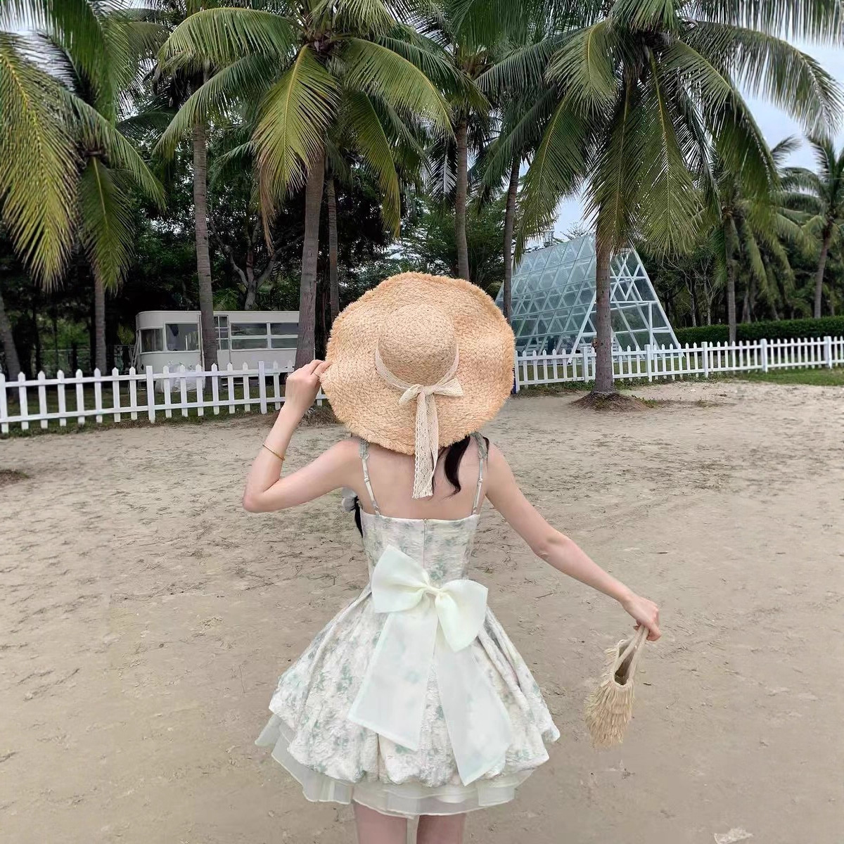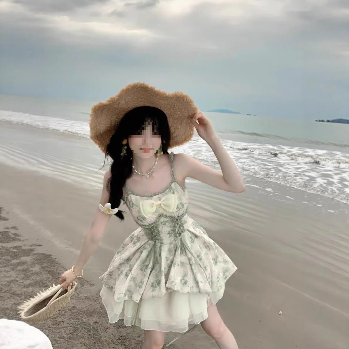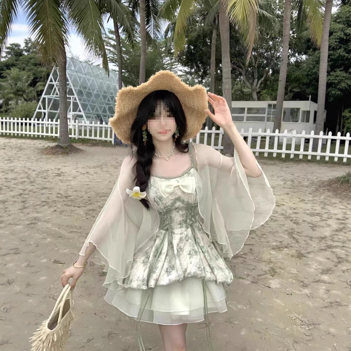 季夏之声 森林精灵印花收腰大蝴蝶结花苞公主连衣裙开衫两件套