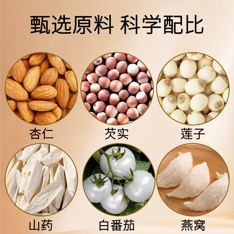 杏仁、莲子、芡实、山药 百合、葛根、茯苓、白番茄、燕窝粉、鱼胶原蛋白肽、雨生红球藻(含虾青素)两歧双