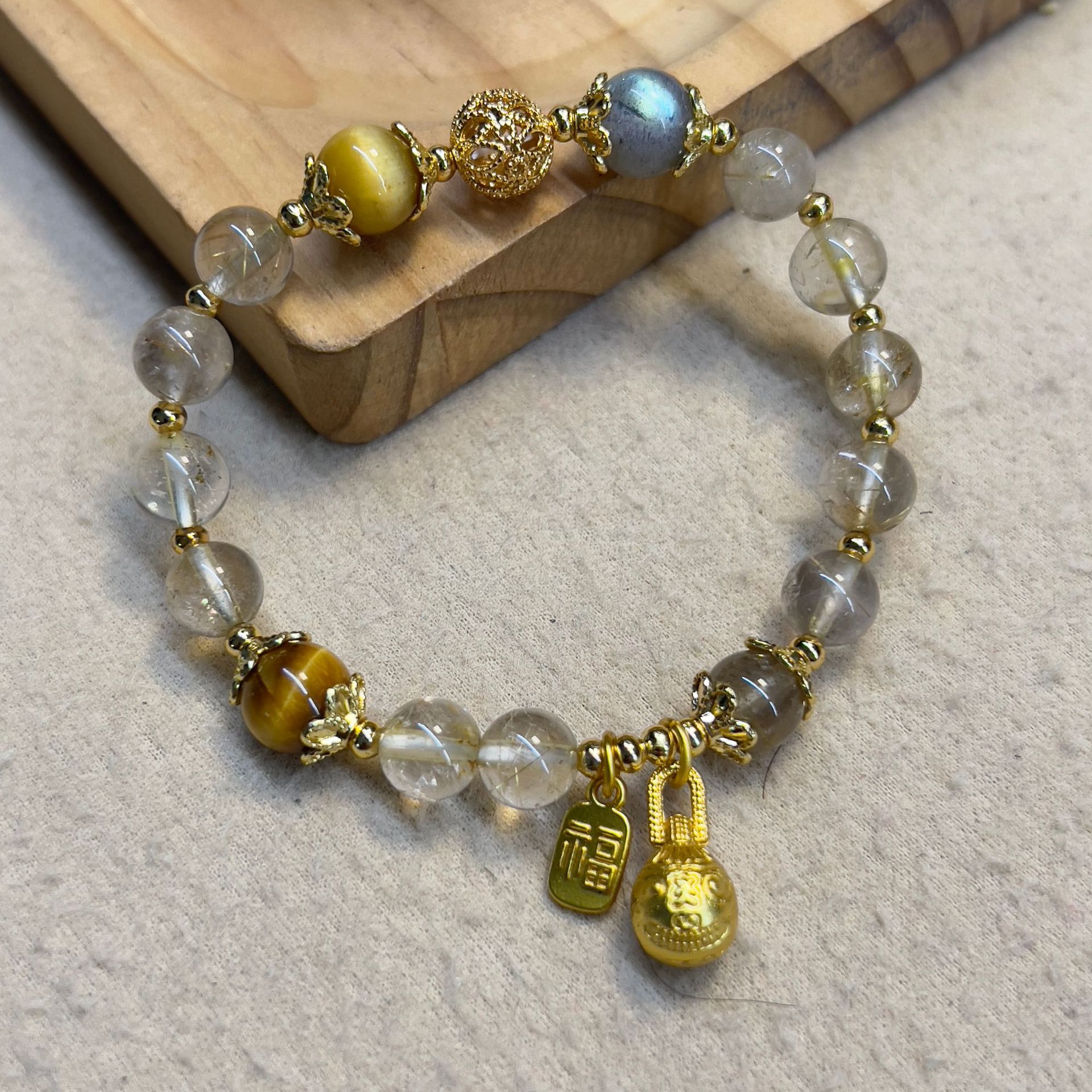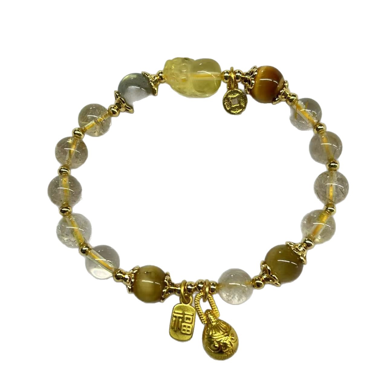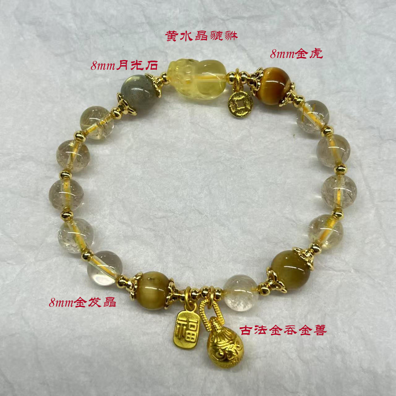 天然金发晶黄水晶貔貅月光石手链女吞金兽招财钛晶黄发晶财富手串