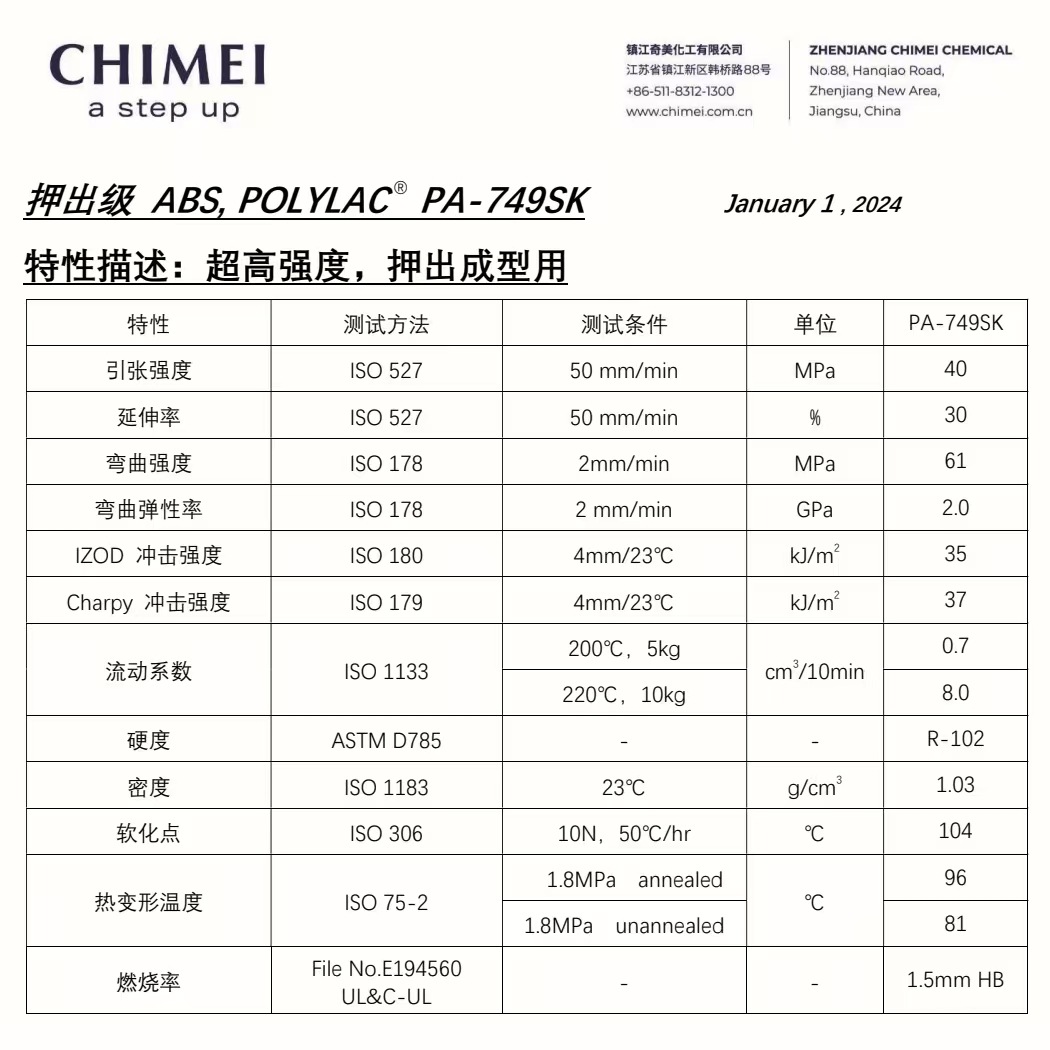 原产国/地区ABS 镇江奇美 PA-749SK 耐冲击级
