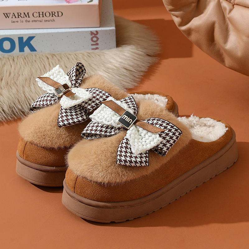 棉拖鞋女秋冬季新款现货批发家居厚底保暖居家用蝴蝶结毛毛绒拖鞋
