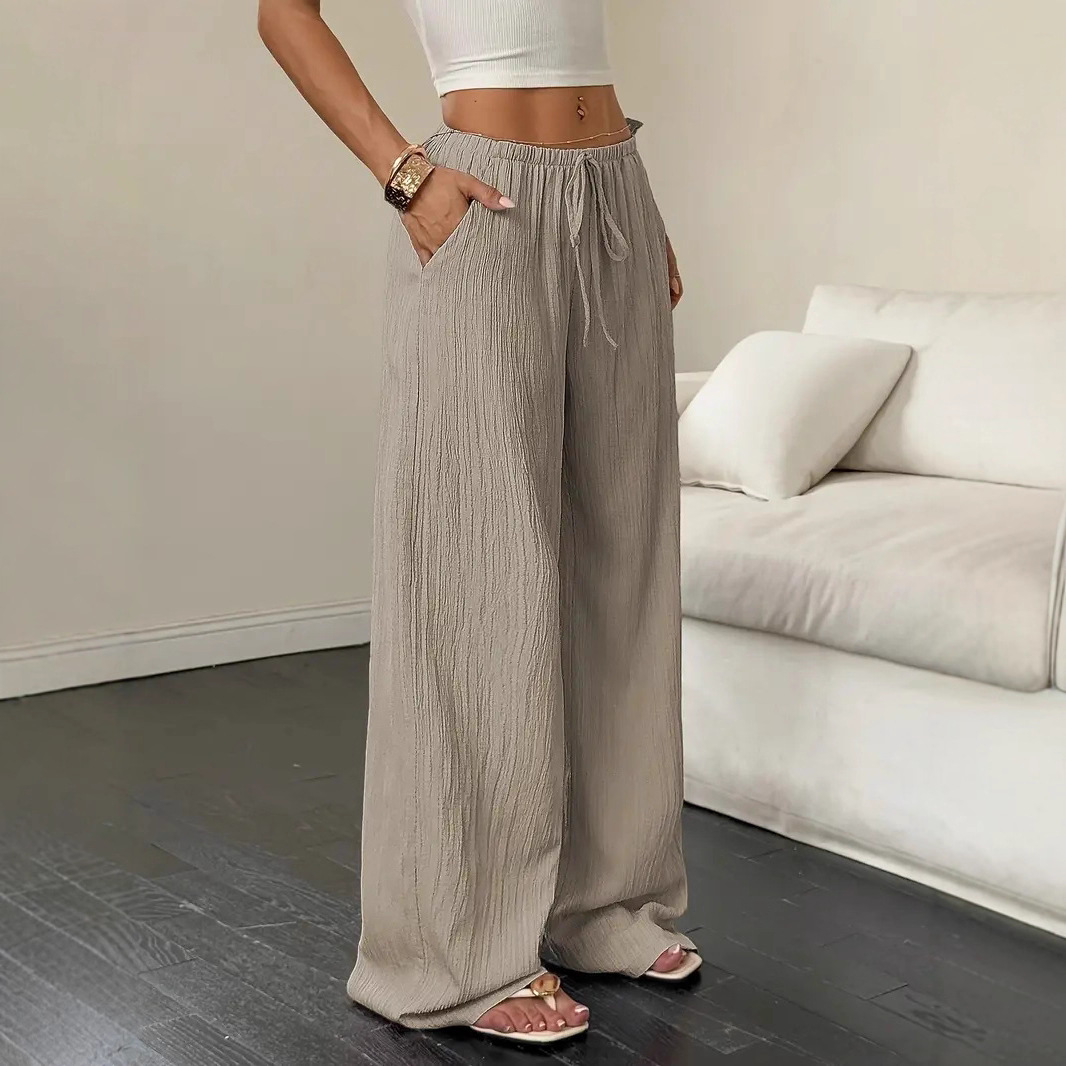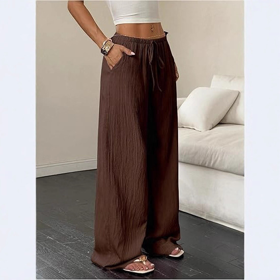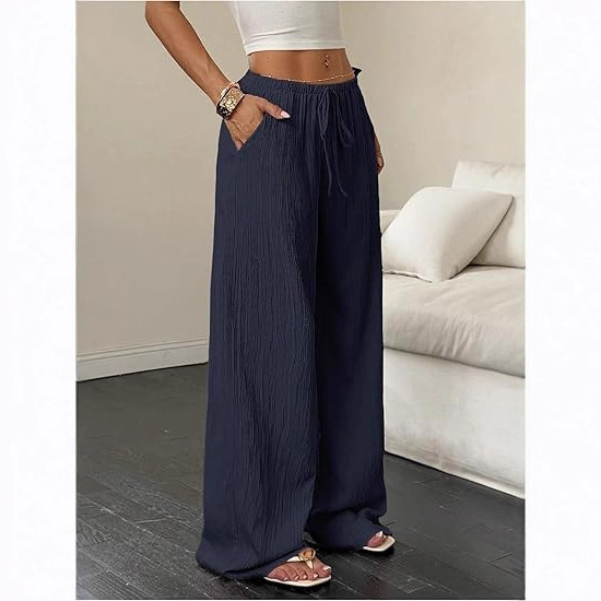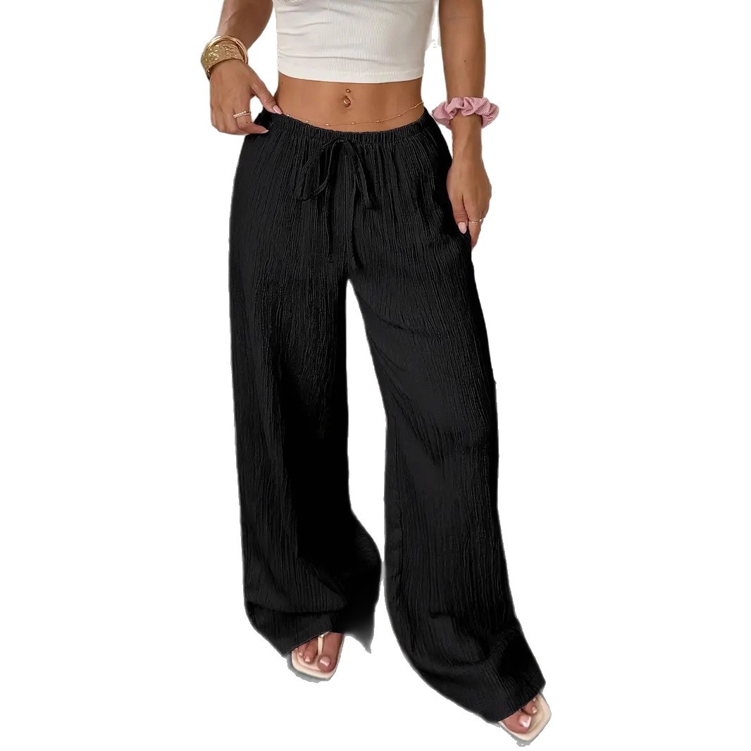 2025年欧美跨境新款女士休闲纯色纹理面料打结腰部斜口袋阔腿裤女