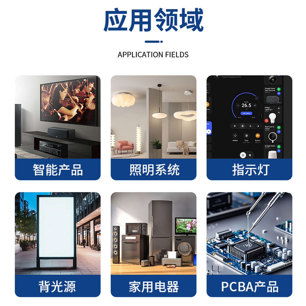 智能产品、照明系统、指示灯、背光源、家用电器、PCBA产品等...