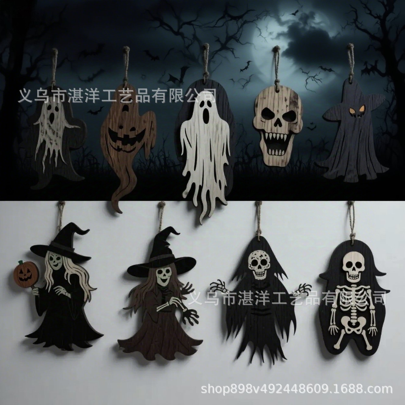 Halloween Ghost Ornaments万圣节木质幽灵蝙蝠蜘蛛节日装饰挂件