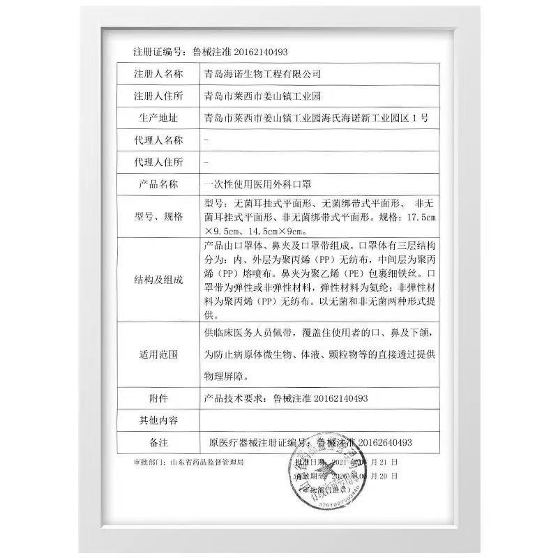 | 产品注册证 | 鲁械注准20162140493 | 备案证 | 鲁械注准20162140493 |