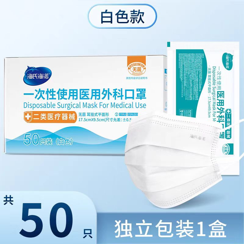 | 规格 | 海氏海诺 A149一次性使用医用外科口罩 (薄款 无菌 独立)17.5×9.5cm (成人)20支— | 规格 | 海氏海诺 一次性使用医用外科口罩 (无菌 白色)独立装 50只/盒—1盒 |