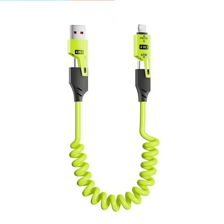 工厂现货高品质弹簧伸缩四合一超级快充数据线适用苹果华为锌合金