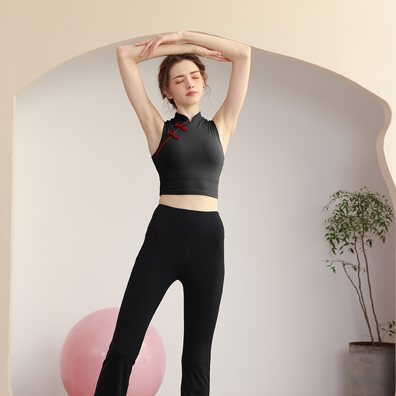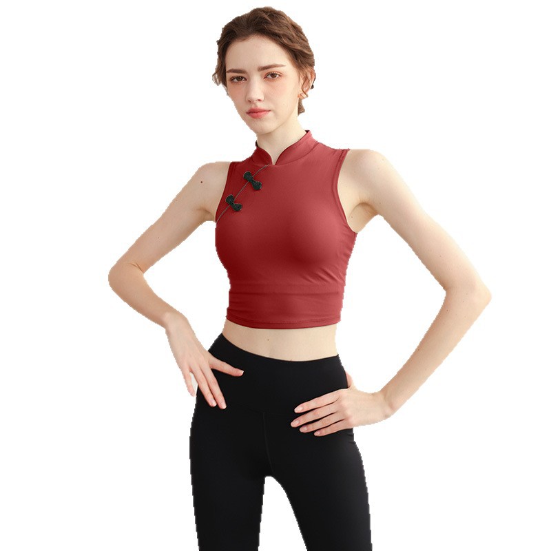 中式瑜伽服国风立领无袖背心女带胸垫外穿紧身运动健身速干运动服