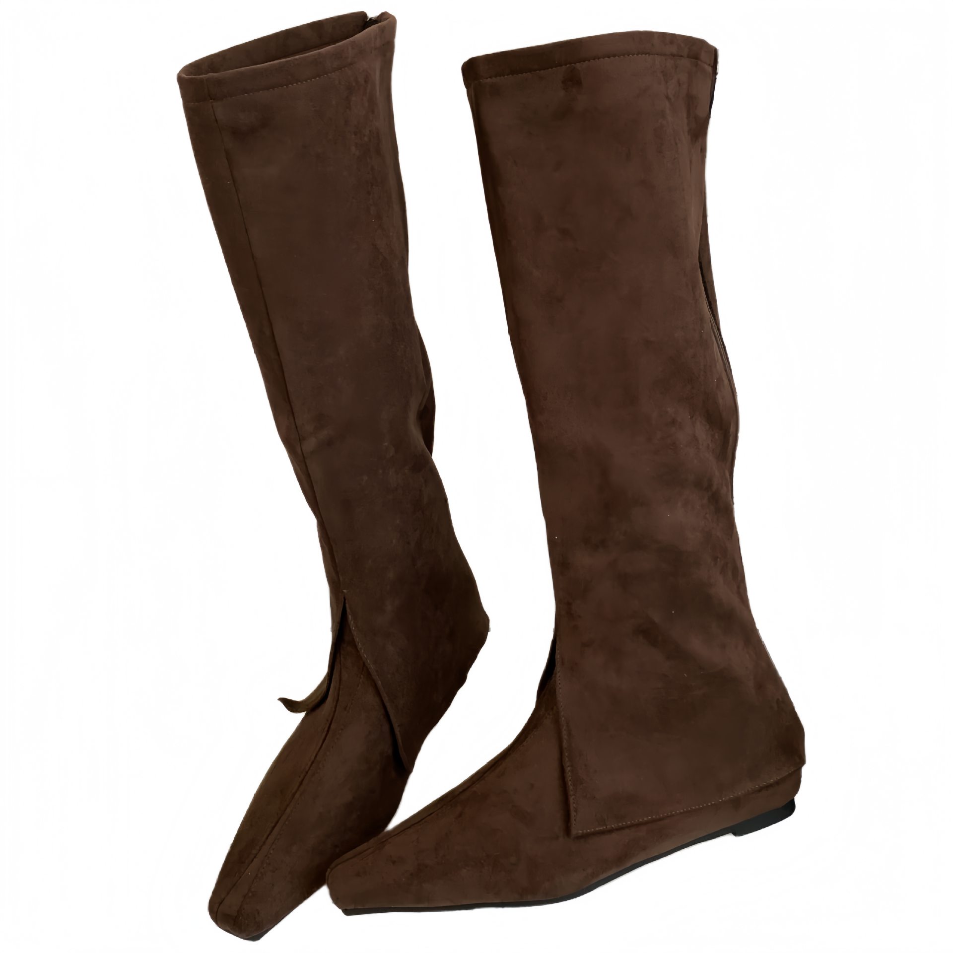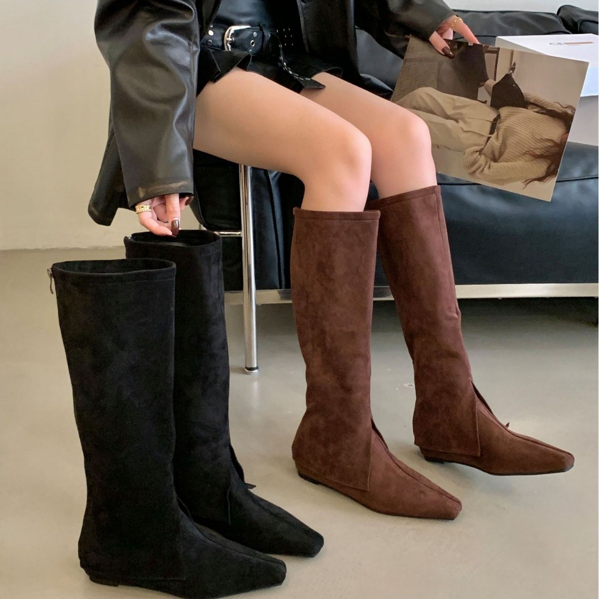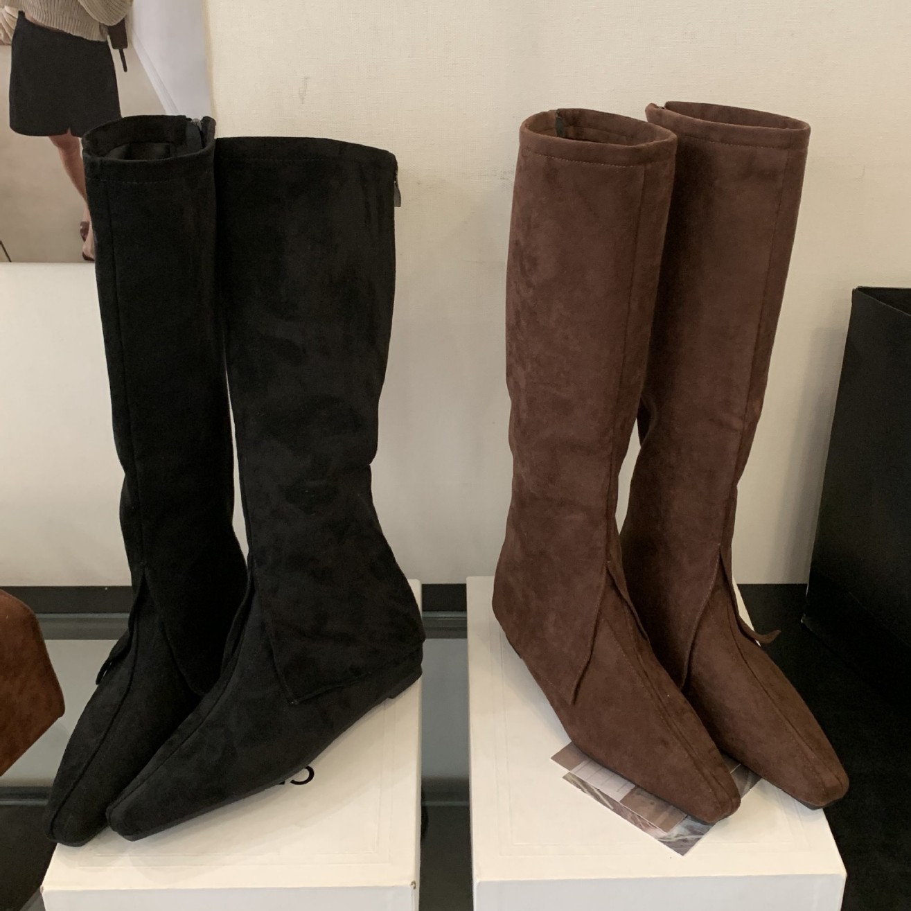 2025年新款秋冬季绒面小方头坡跟女长靴内增高时尚不过膝高筒长靴