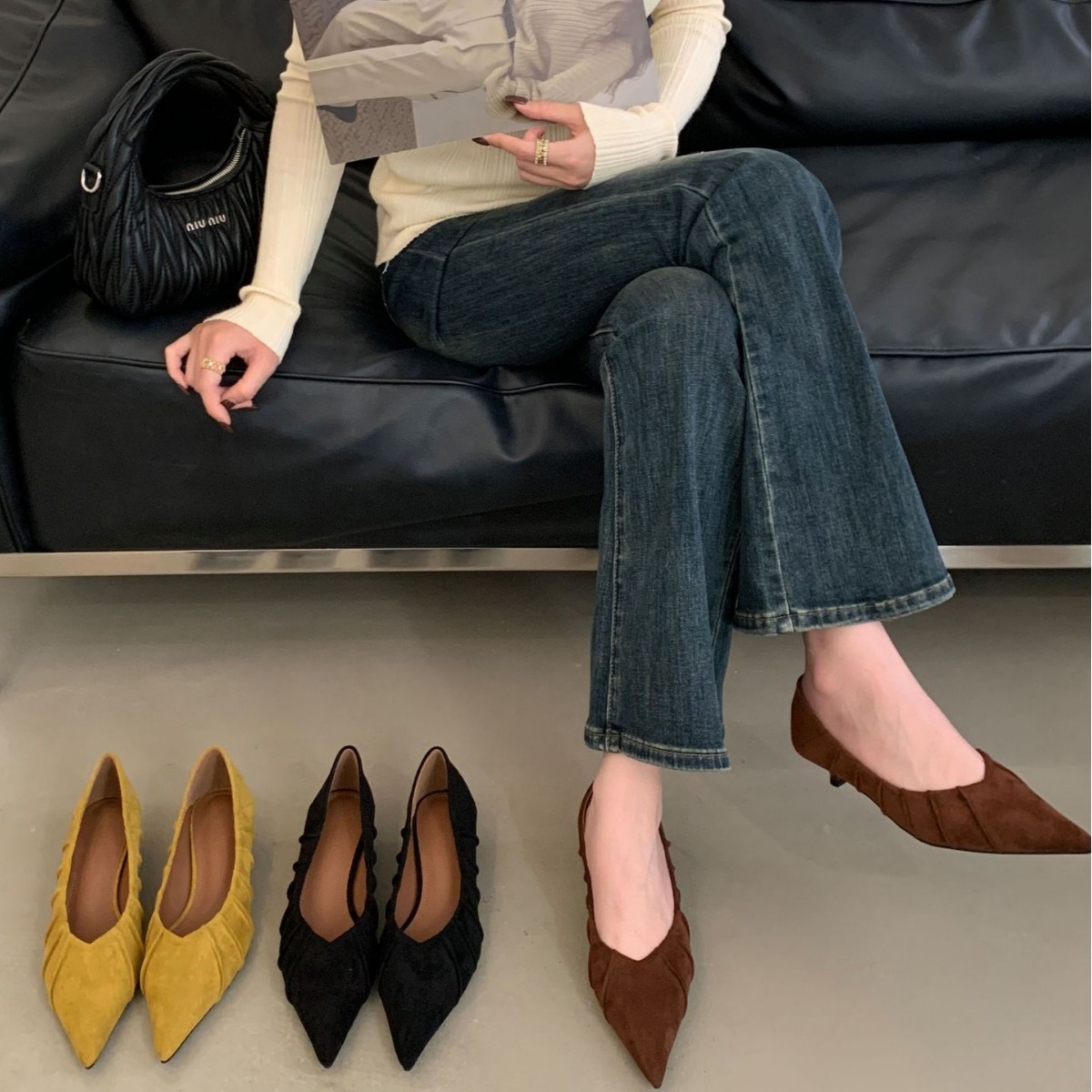法式尖头褶皱款细跟中跟浅口女单鞋2025秋季小众设计感气质女单鞋