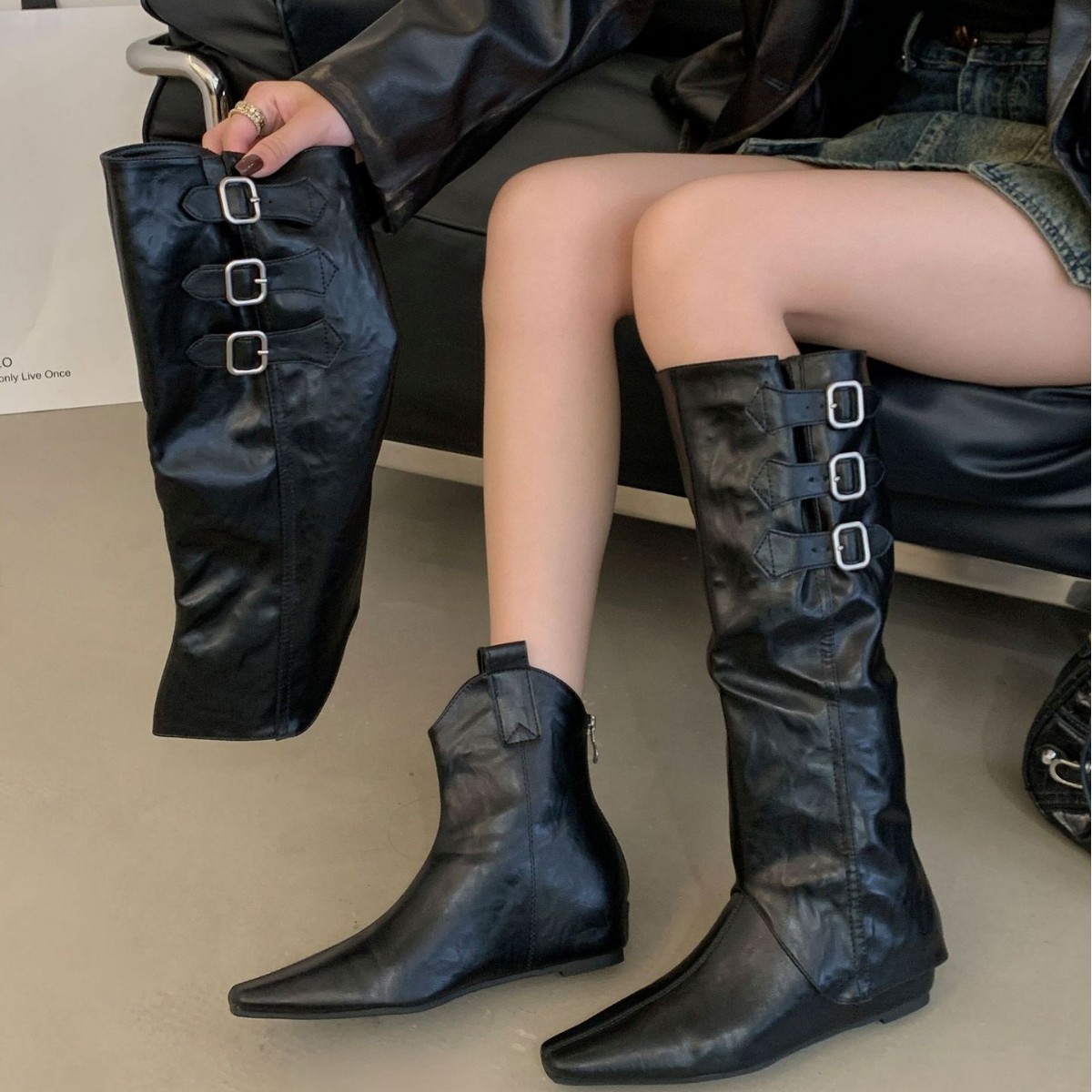 2025秋冬新款可两穿款可拆卸靴筒皮带扣小方头平底短靴高筒女长靴