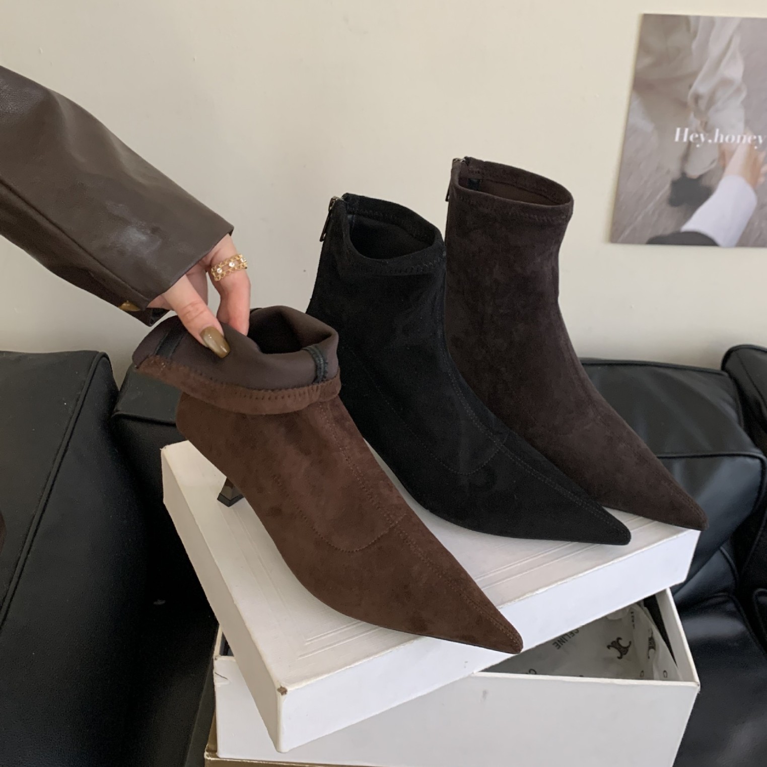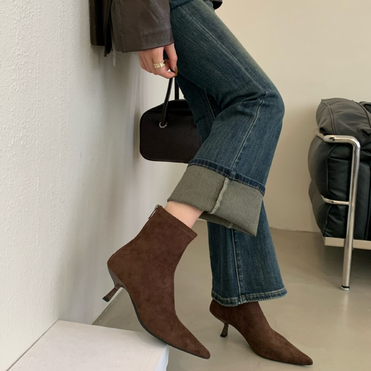 尖头细跟女短筒靴2024秋季韩版新款细跟时装靴中跟绒面猫跟时装靴