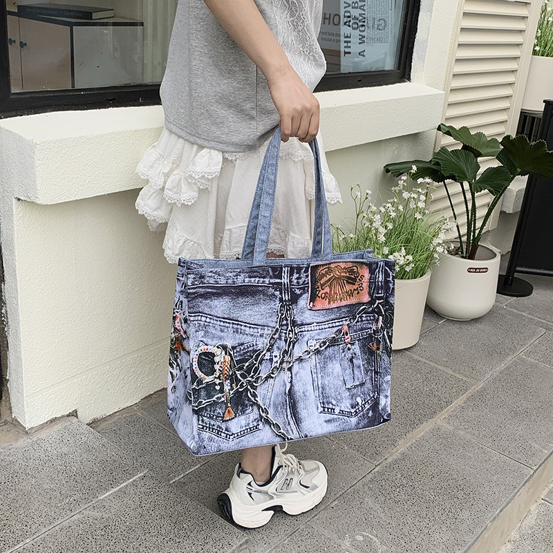 牛仔布托特包网红同款数码喷涂帆布单间包包女韩版跨境复古斜挎包