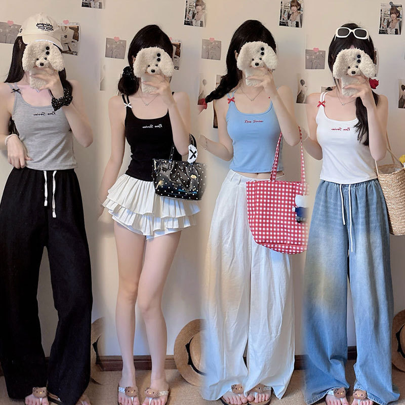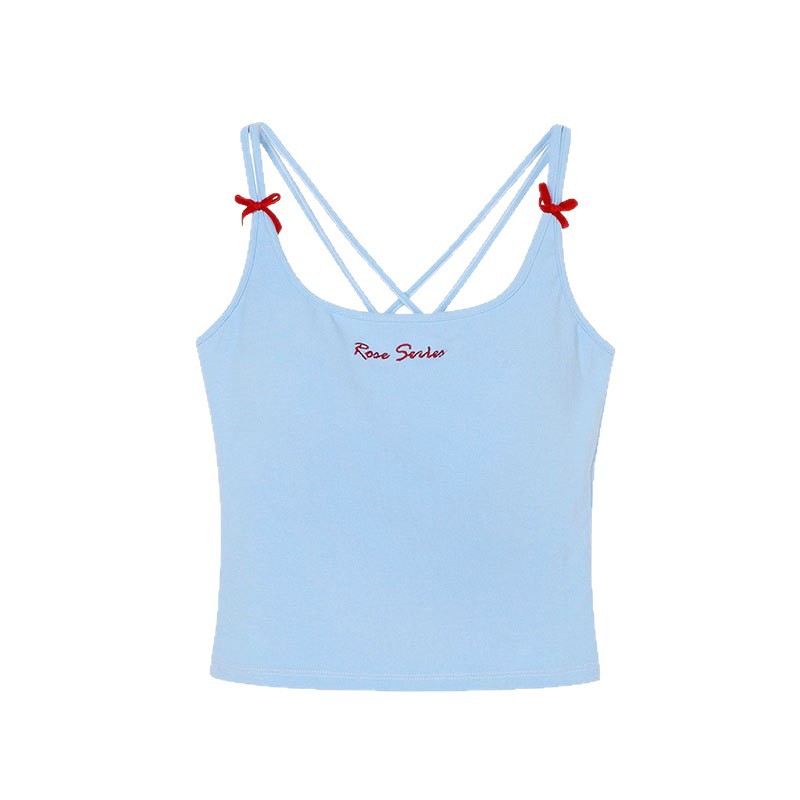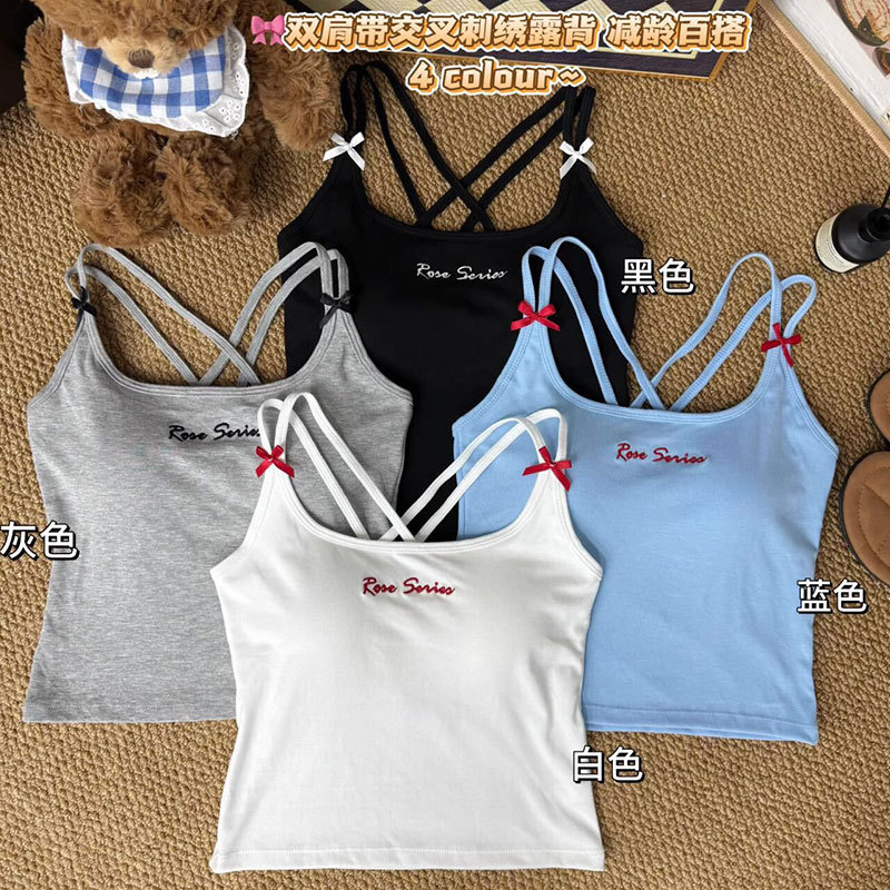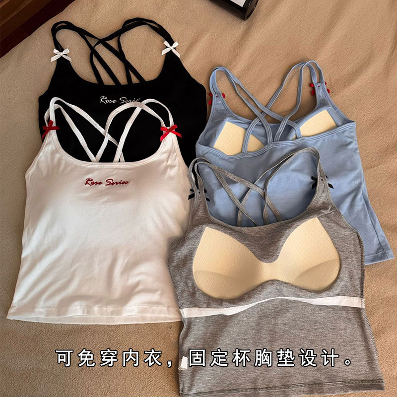 夏季辣妹款交叉带蝴蝶结刺绣吊带美背心带胸垫内衣外穿打底上衣女