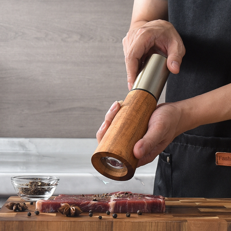 不锈钢拉丝钢头款海盐胡椒磨厨房实木调料罐手动陶瓷芯花椒研磨器