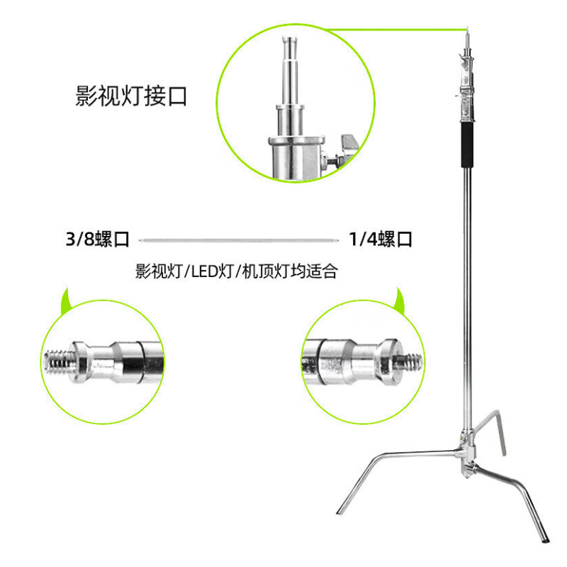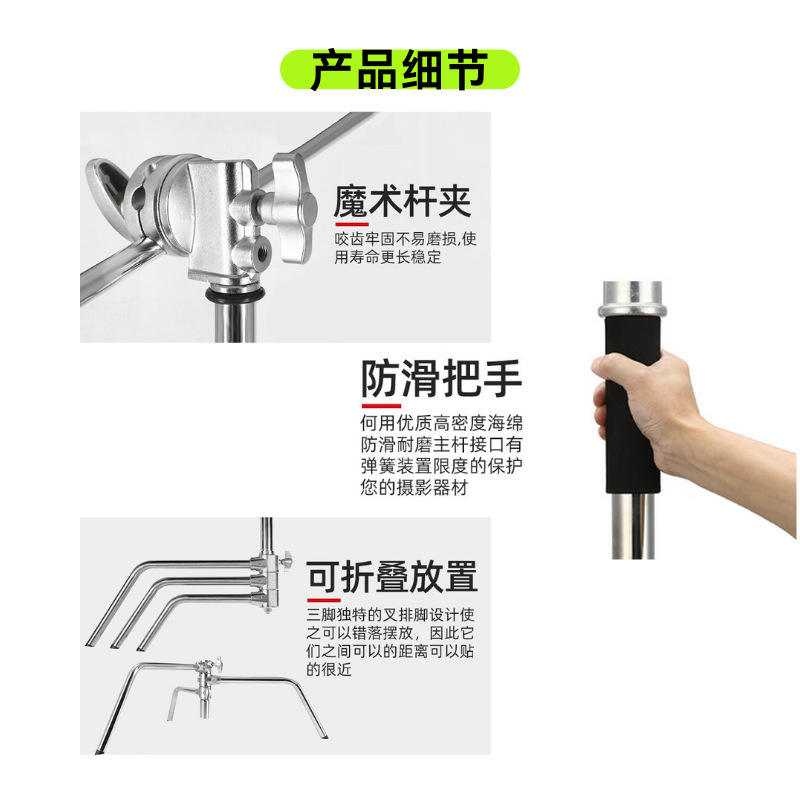 | 包装清单 | C型脚架*1,灯架主杆*1,金属横杆*1,魔术头*2 | 颜色 | 3.3米魔术腿C型架套装 |