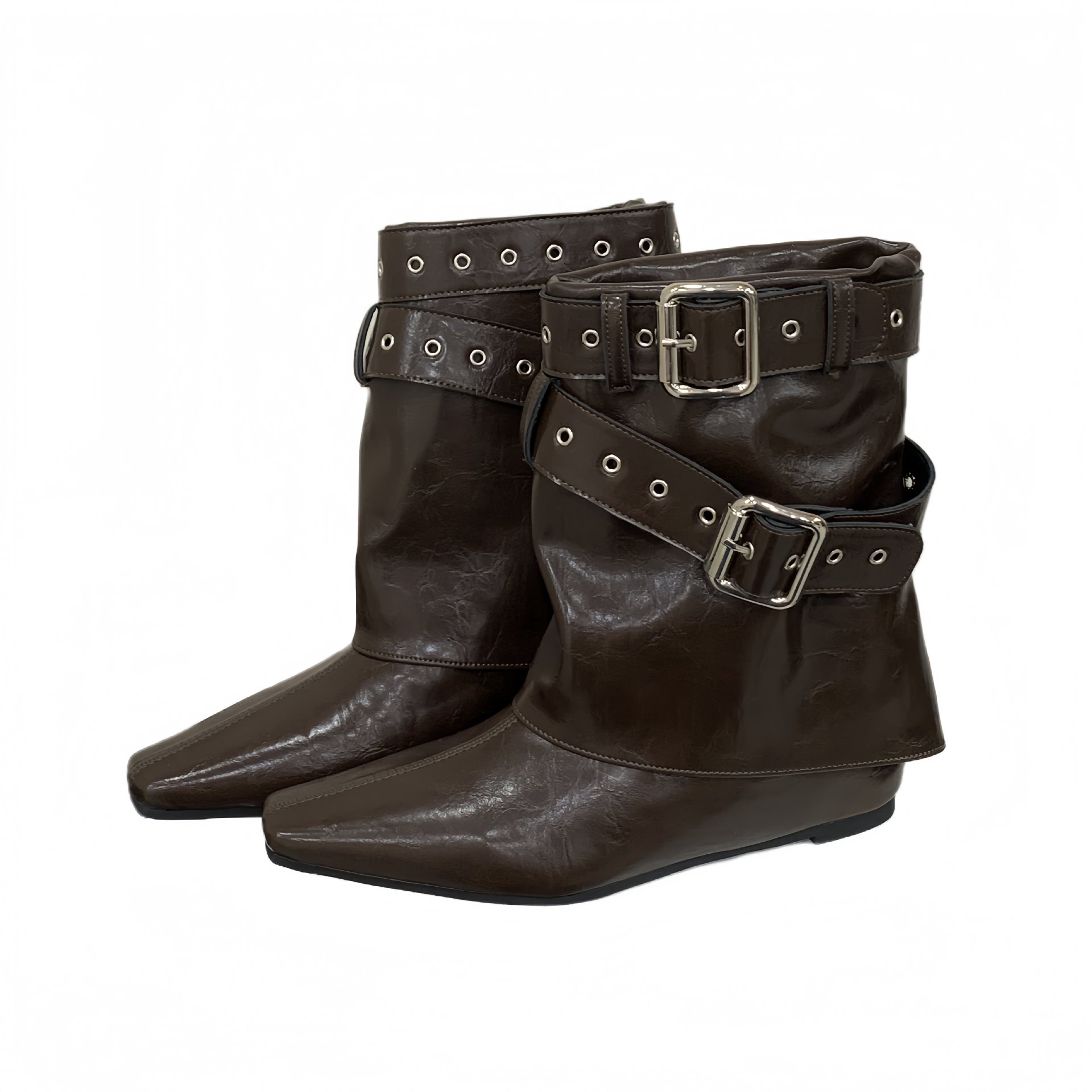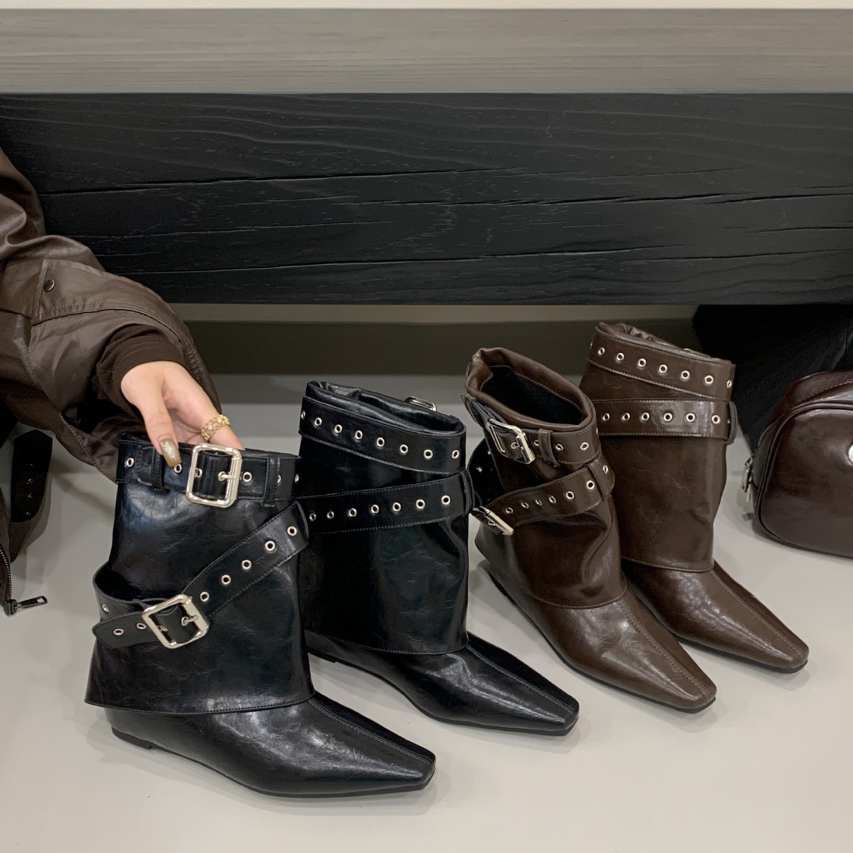 2025年秋冬季宽筒内增高气质小方头短靴皮带扣短筒时尚百搭女长靴