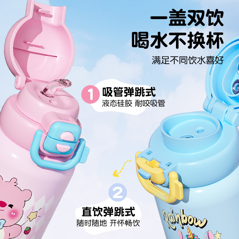 卡通新款儿童保温杯女高颜值一杯双饮弹跳杯户外露营斜跨式吸管杯