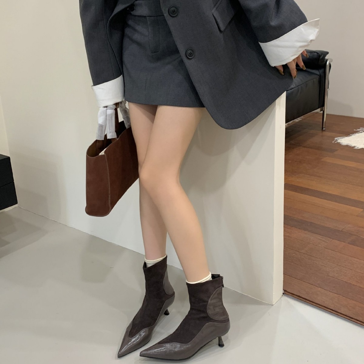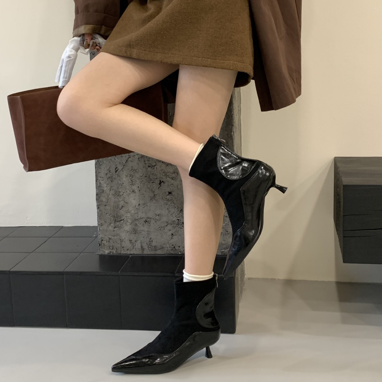 秋冬新款欧美长靴2025年尖头细跟绒面拼接猫跟套筒瘦瘦靴短筒女靴
