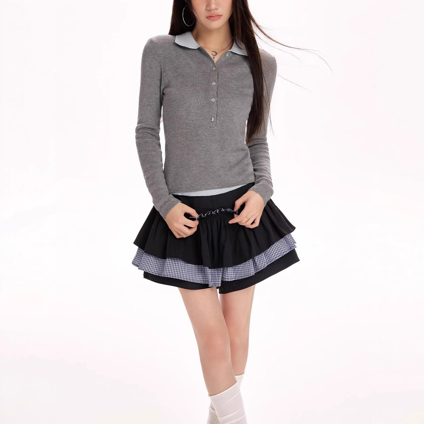 灰色翻领长袖针织衫女假两件春秋新款修身显瘦内搭打底衫百搭上衣