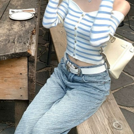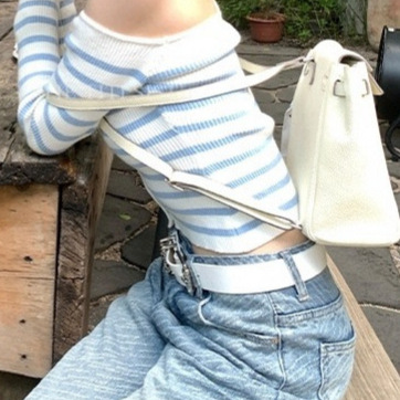 tit小姐姐【日光岛屿】条纹针织衫女秋季一字肩修身短款打底上衣