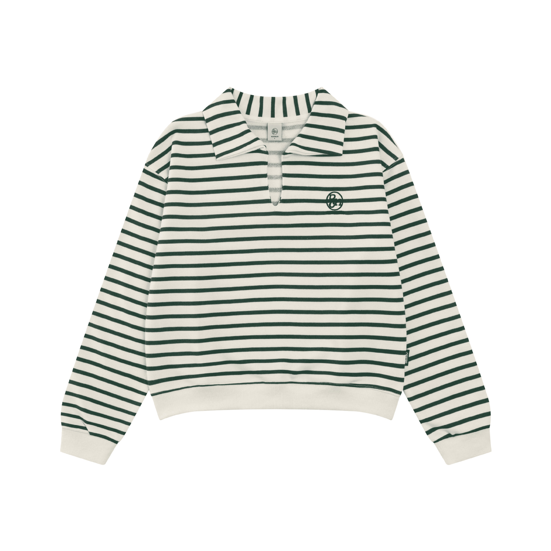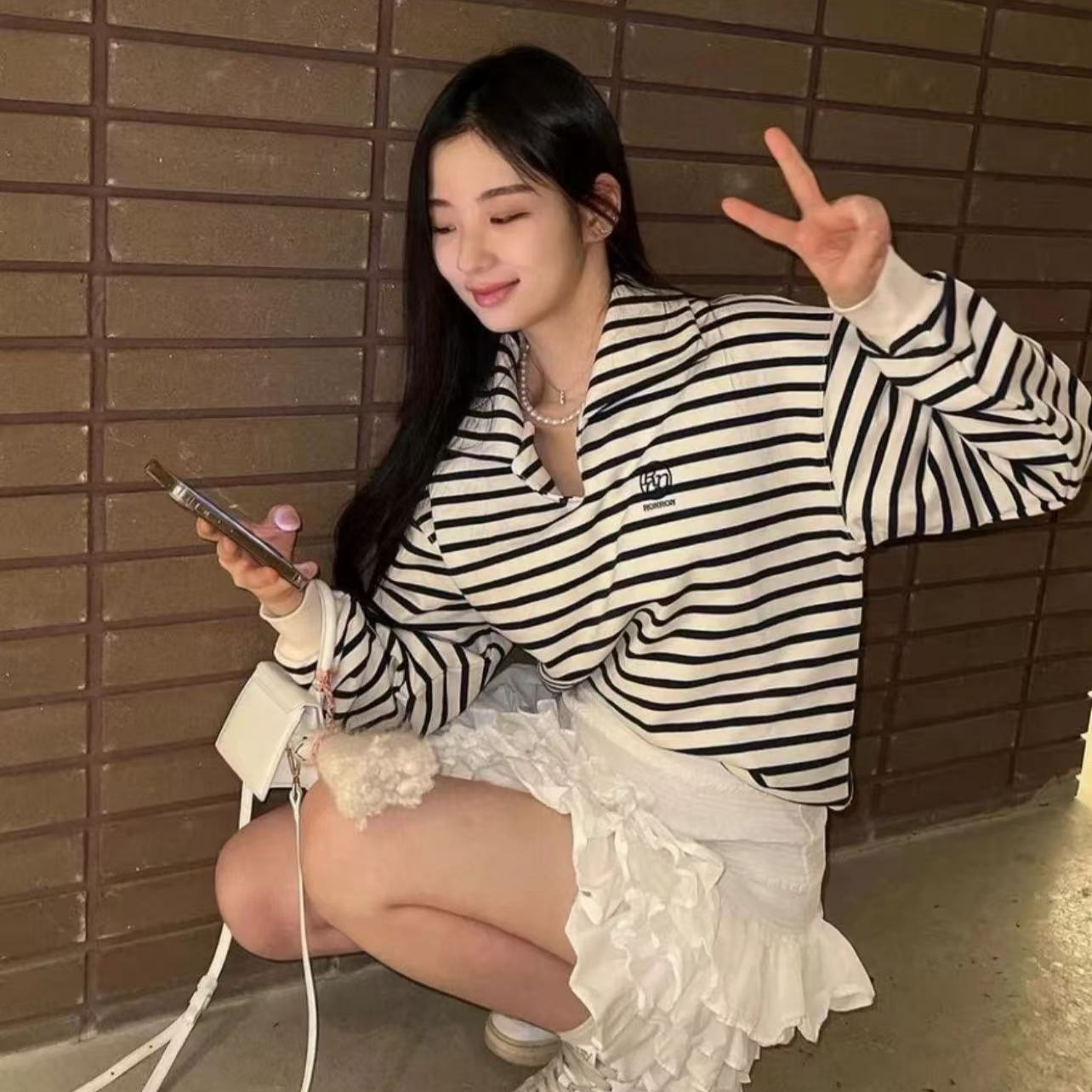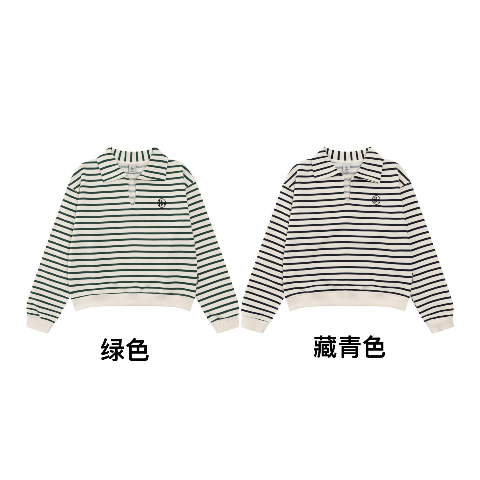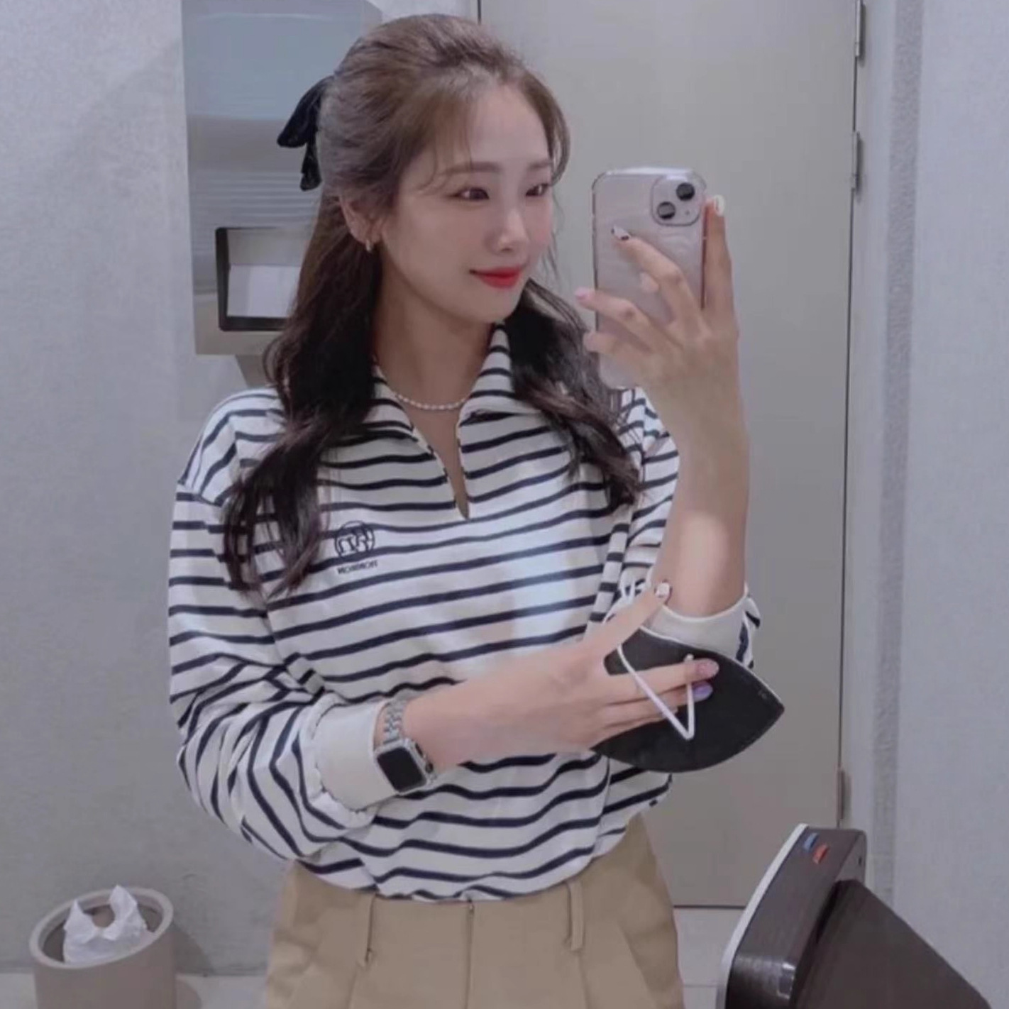 RONRON裴珠泫同款条纹卫衣翻领女宽松休闲POLO上衣秋冬一件代发潮