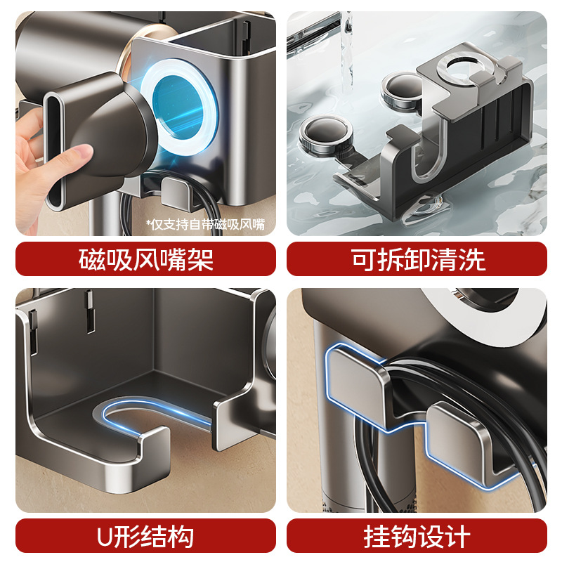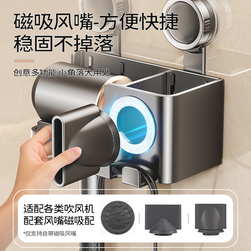 | 尺寸 | 吸盘款-枪灰吹风机置物架(带磁吸风嘴架) | 尺寸 | 吸盘款-奶白吹风机置物架(带磁吸风嘴架) |