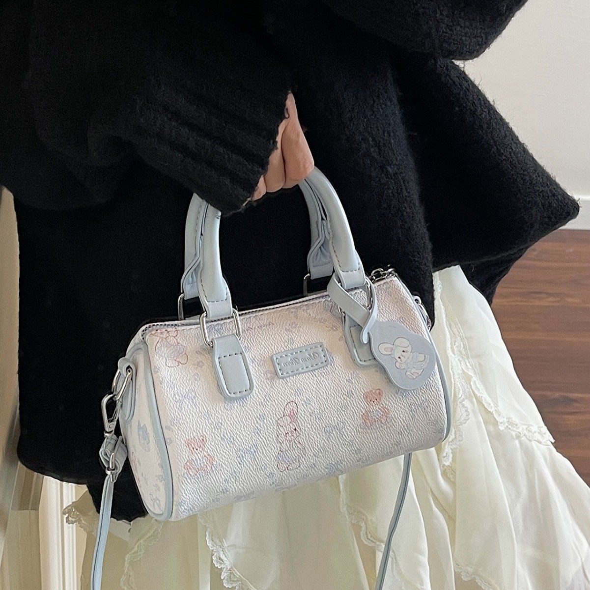 复古可爱印花圆筒包易清洁质感波士顿包简约百搭小众手提斜挎包
