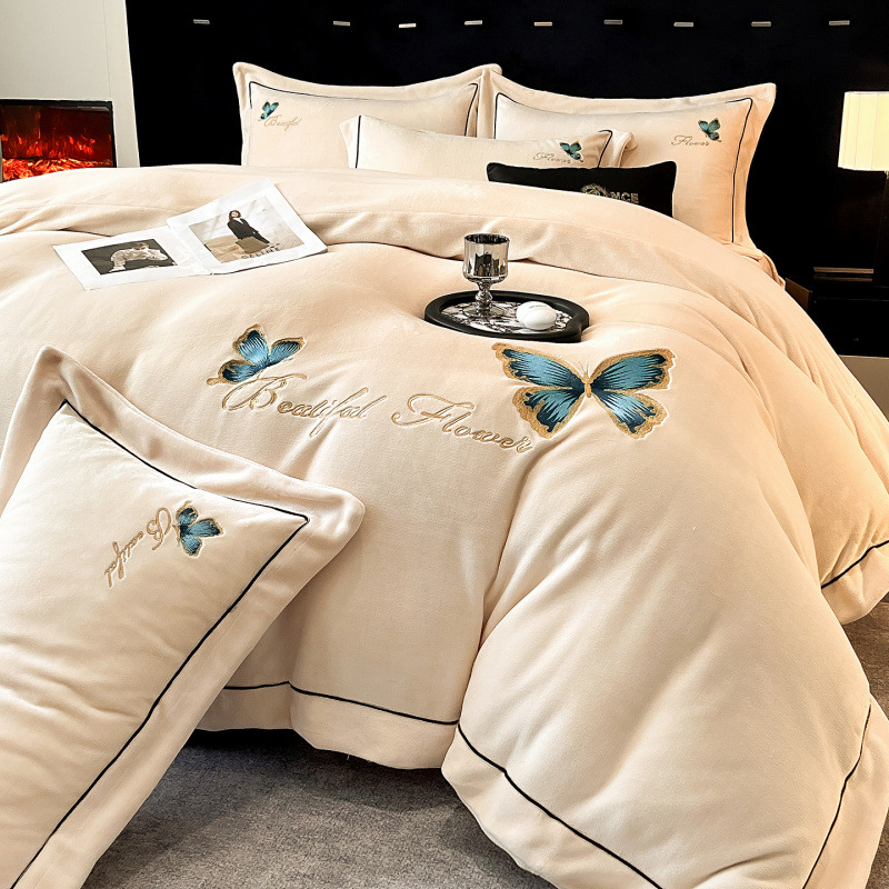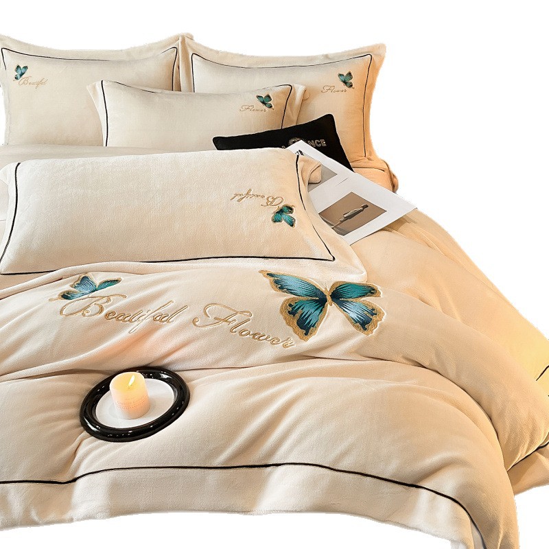 牛奶绒刺绣四件套唯美蝴蝶结系列保暖家用床单被罩床上用品套件