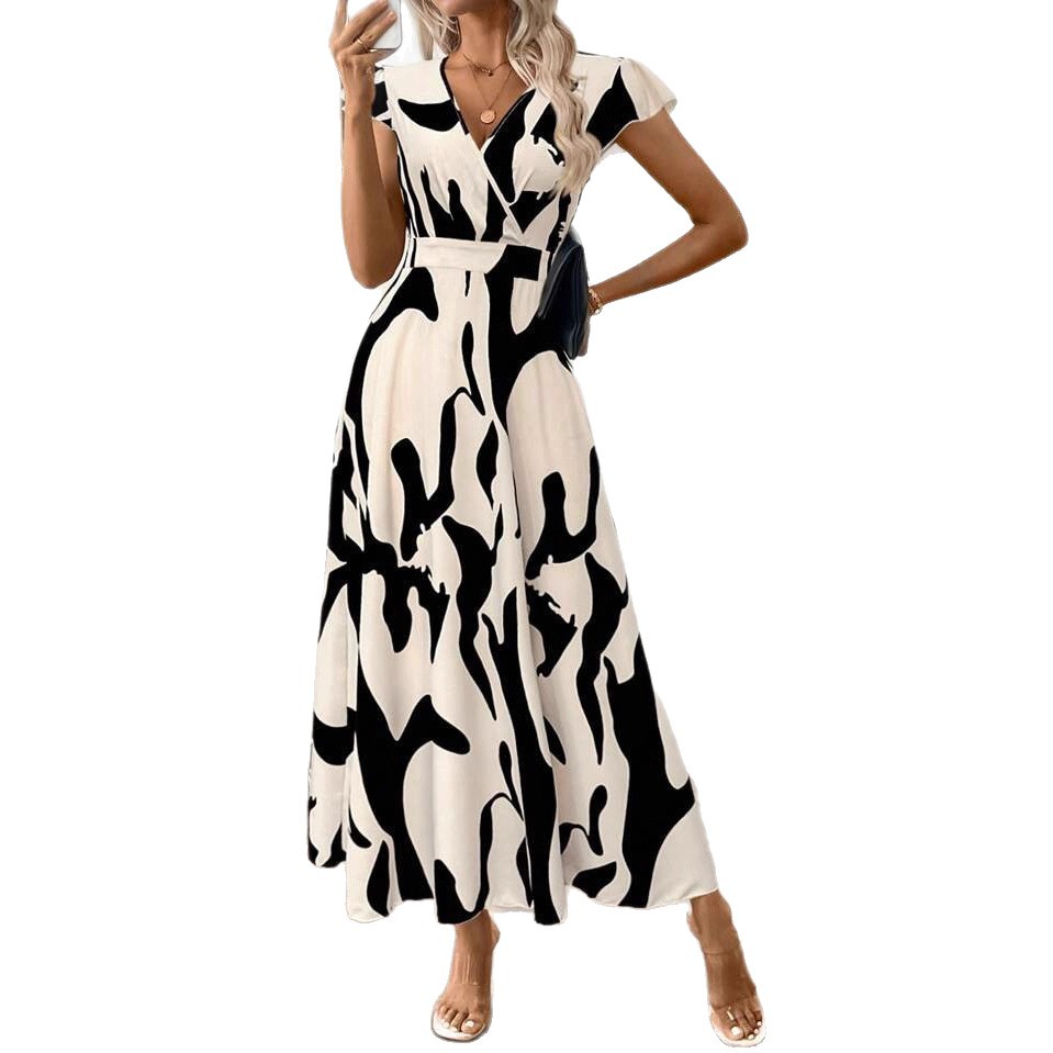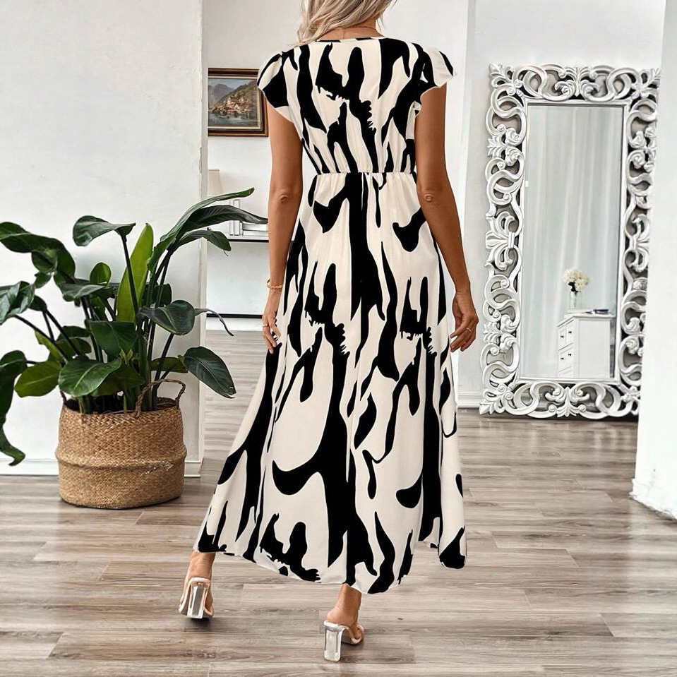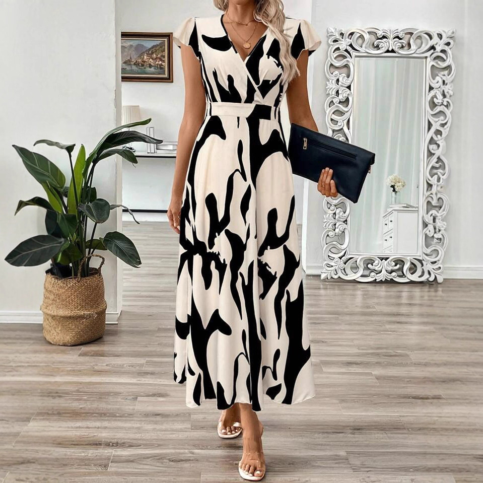 欧美外贸2025独立站夏季新款女装V领长叶印花连衣裙腰部收紧A字裙