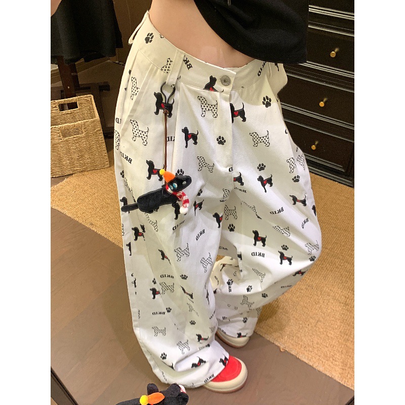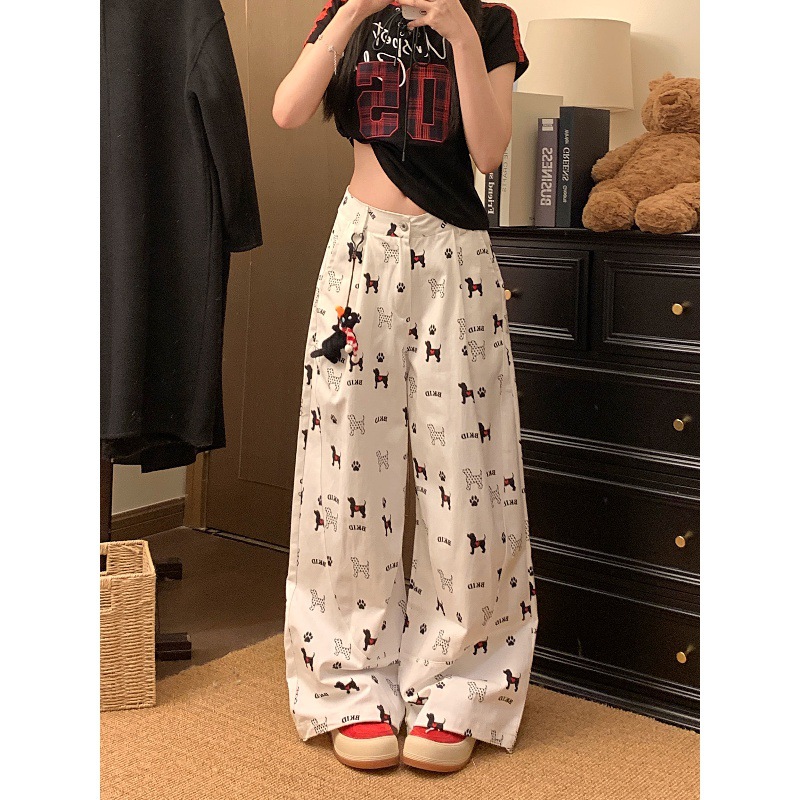 实拍现货美式满印小狗卡通挂件休闲裤女夏宽松垂坠感直筒拖地长裤