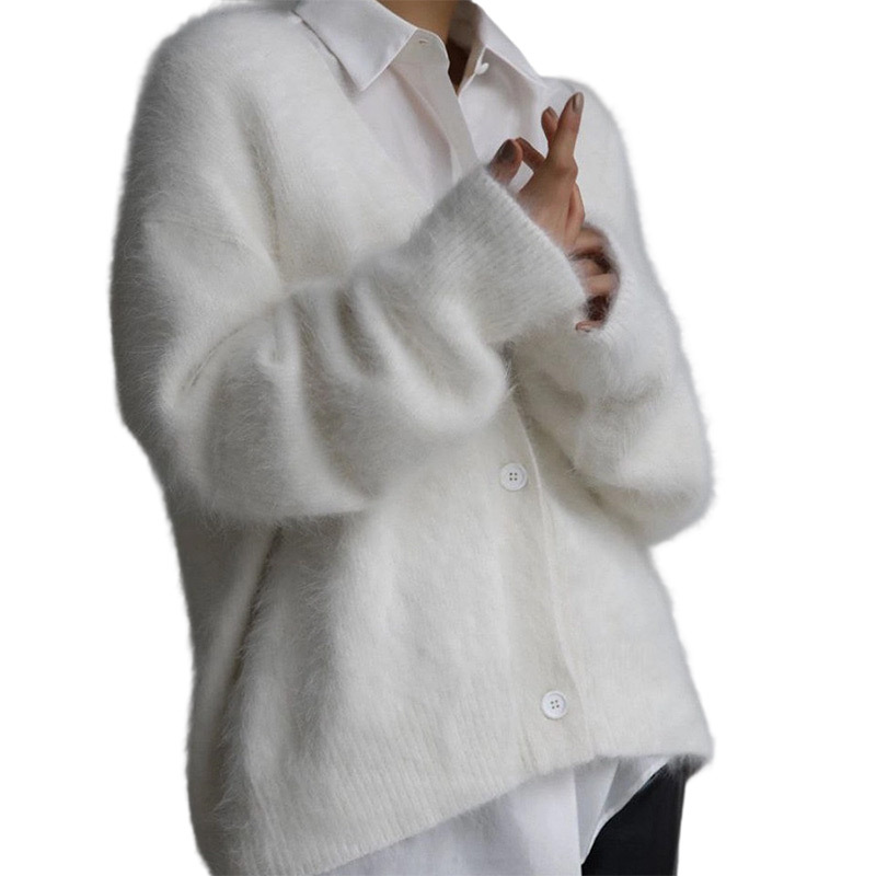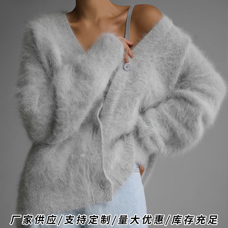 欧美风仿貂毛针织衫2025跨境新款宽松纯色长袖V领毛衣开衫外套女
