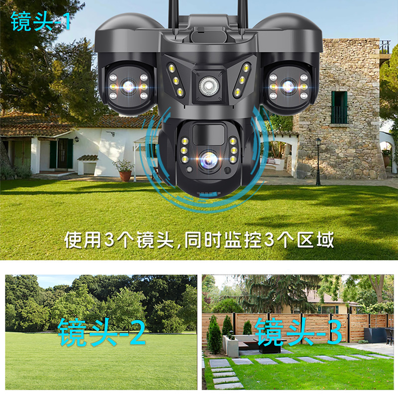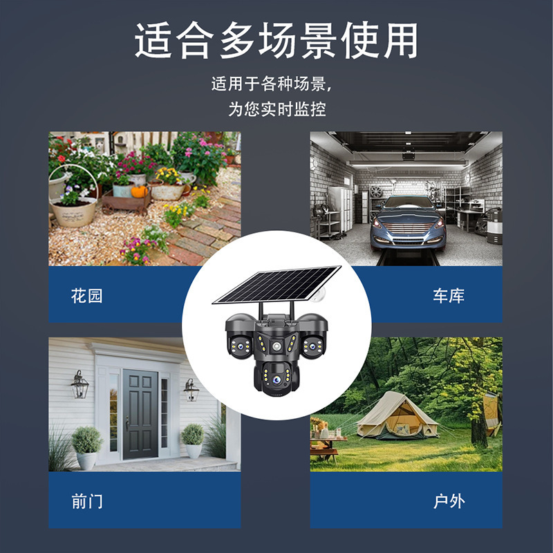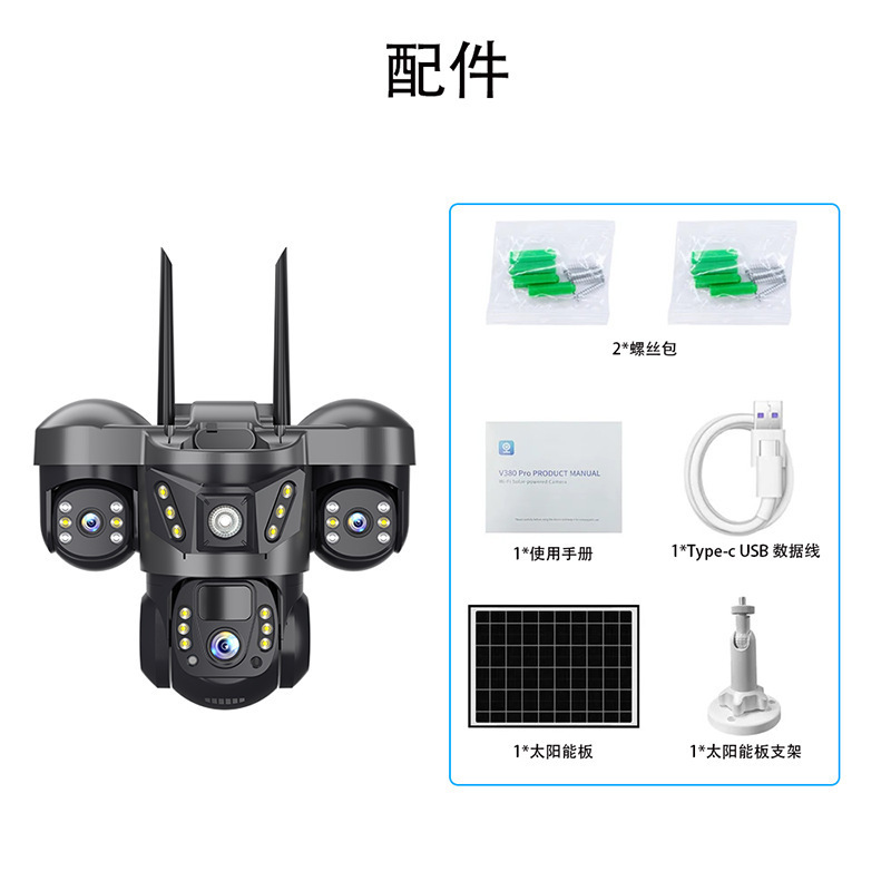 V380太阳能监控摄像头三画面多镜头电网远程监控高清夜视防水