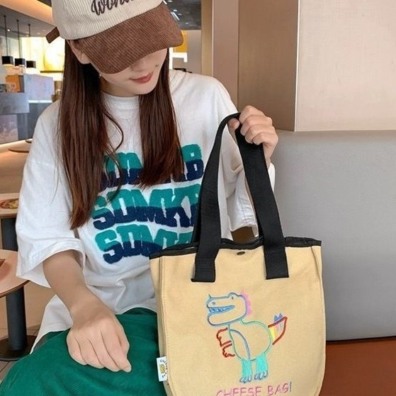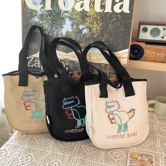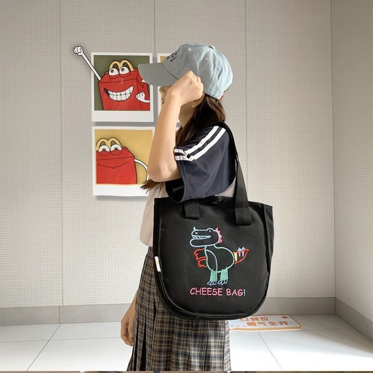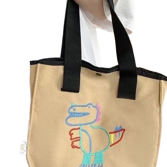可爱卡通恐龙帆布包包女刺绣休闲大容量手提包学生上课通勤托特包