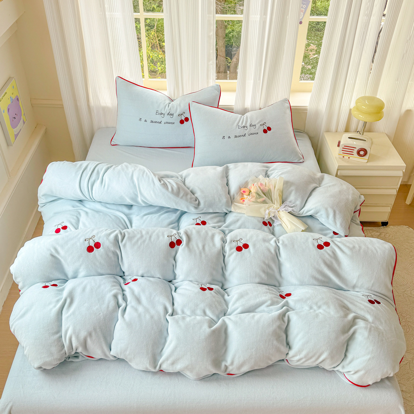 ins小清新冬季加厚保暖牛奶绒四件套小樱桃少女心柔软舒适床单品
