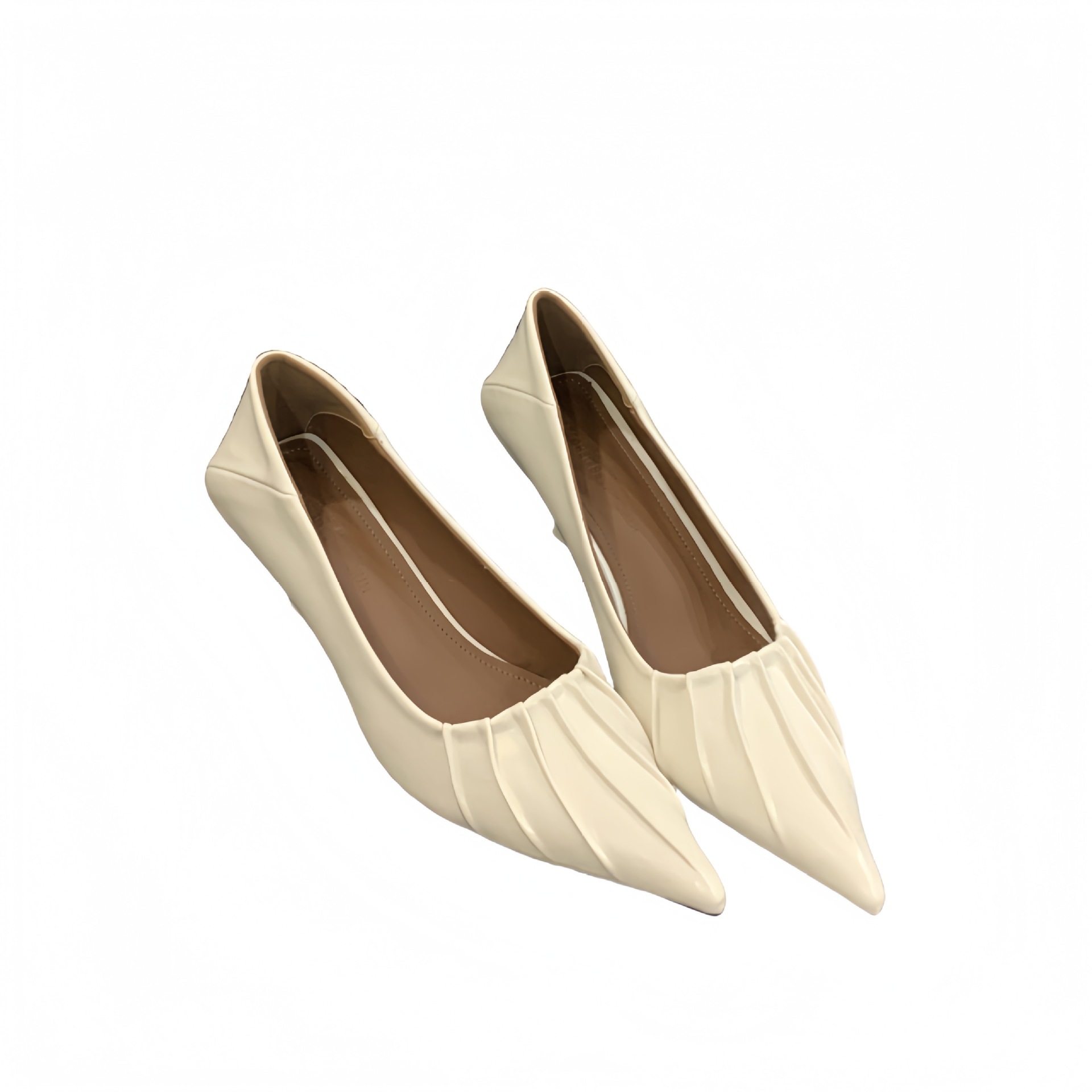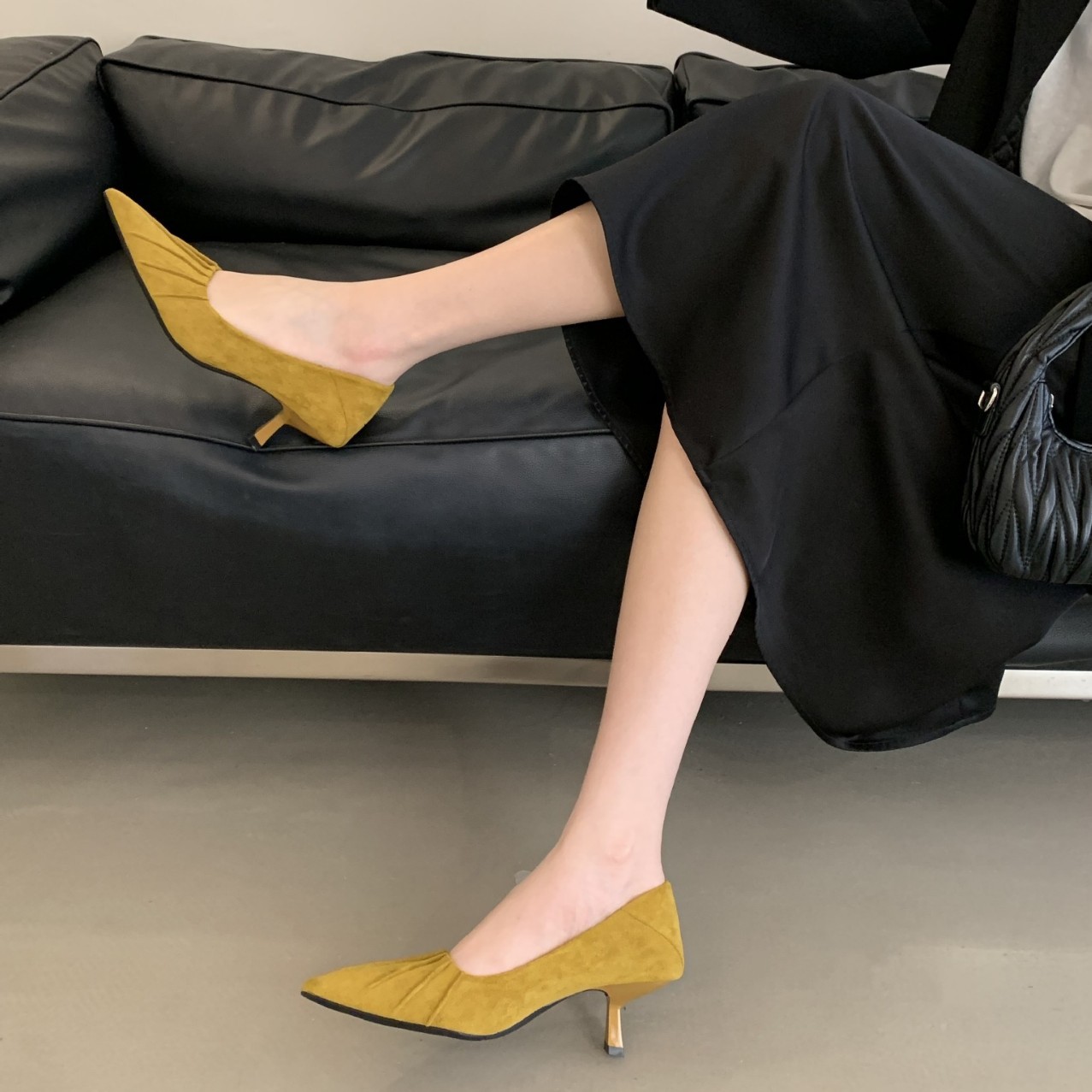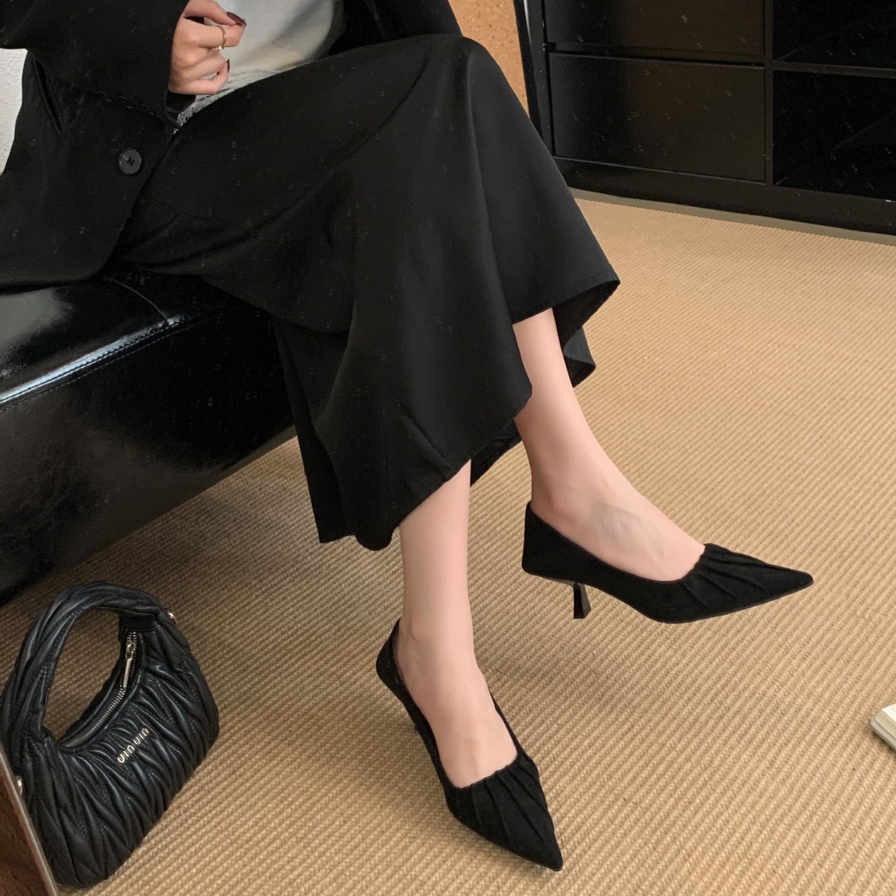 2025新款秋冬季绒面尖头细跟中跟褶皱款纯色百搭高级时尚感女单鞋
