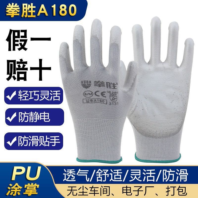 拳胜PU手套电子厂防静电手套A180 防滑耐磨薄款耐用劳保专用手套