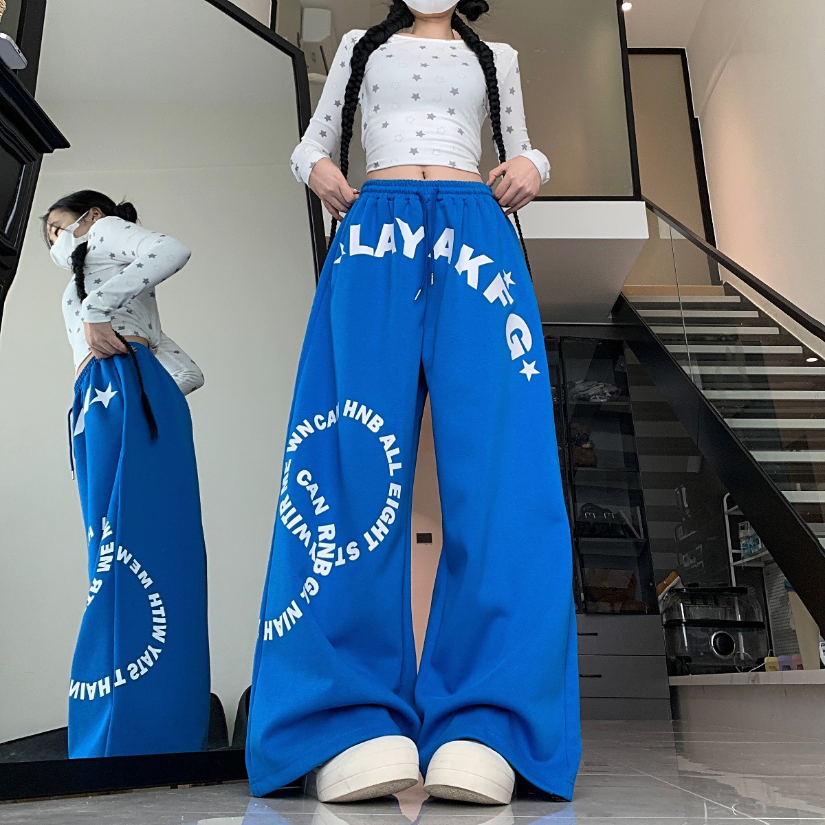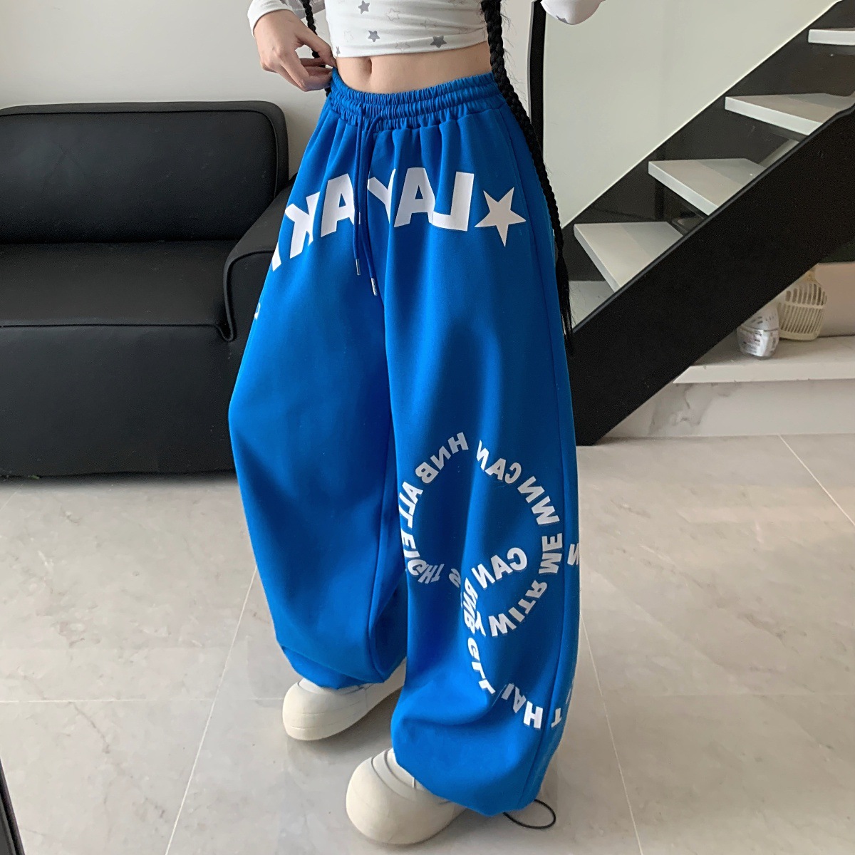 美式字母印花抽绳运动卫裤女早秋街头宽松直筒爵士舞长裤