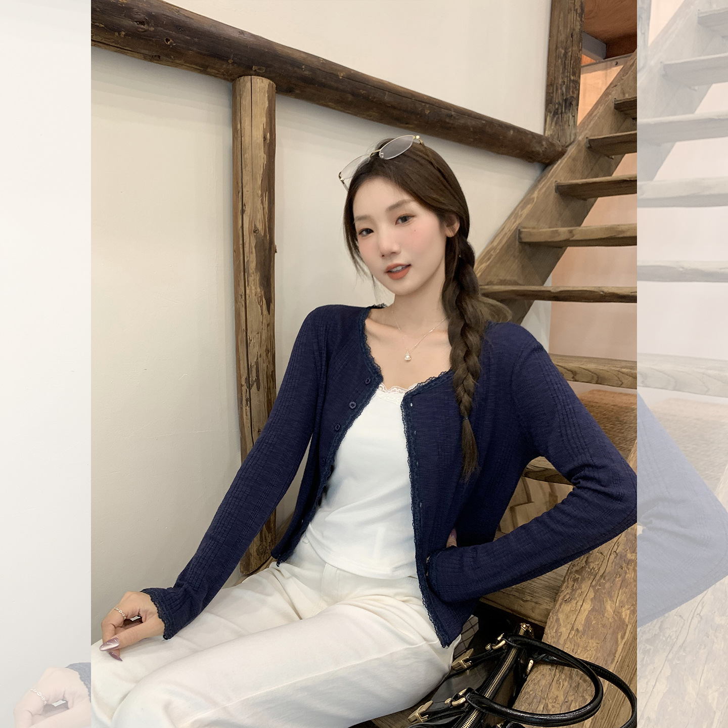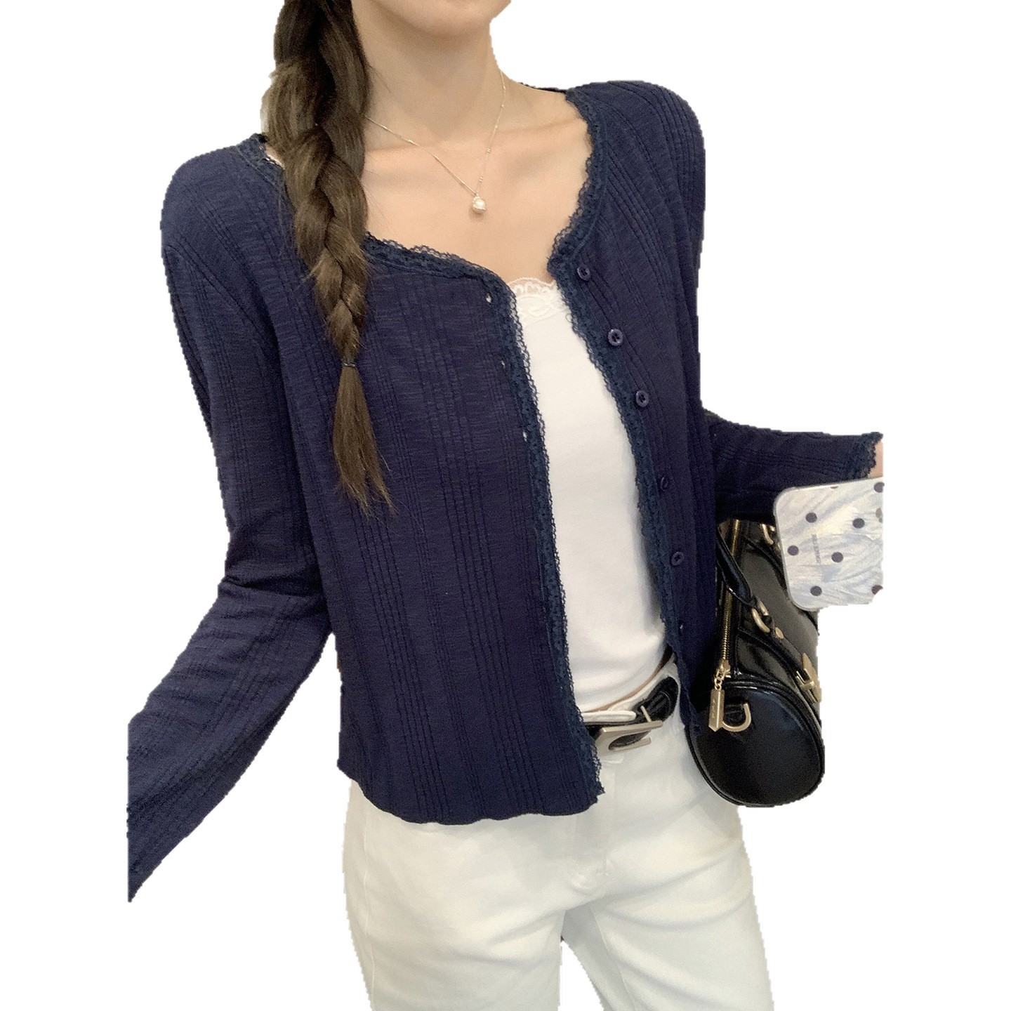实拍实价薄款蕾丝拼接长袖开衫女2025秋季新款宽松显瘦微透小上衣