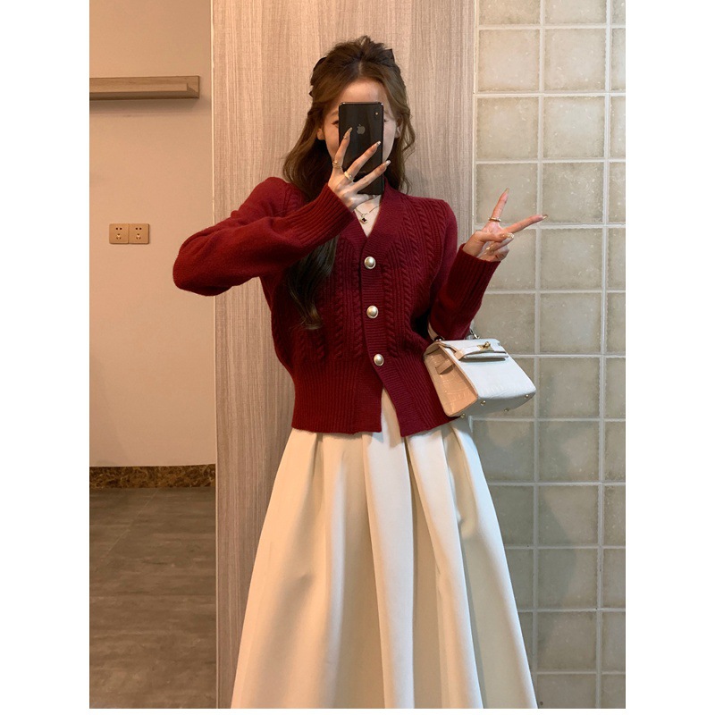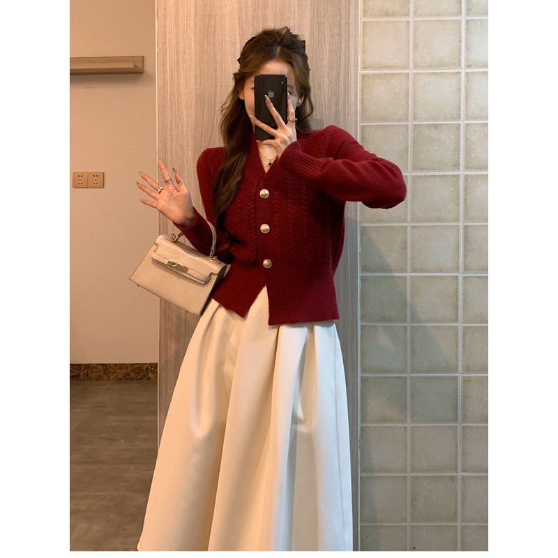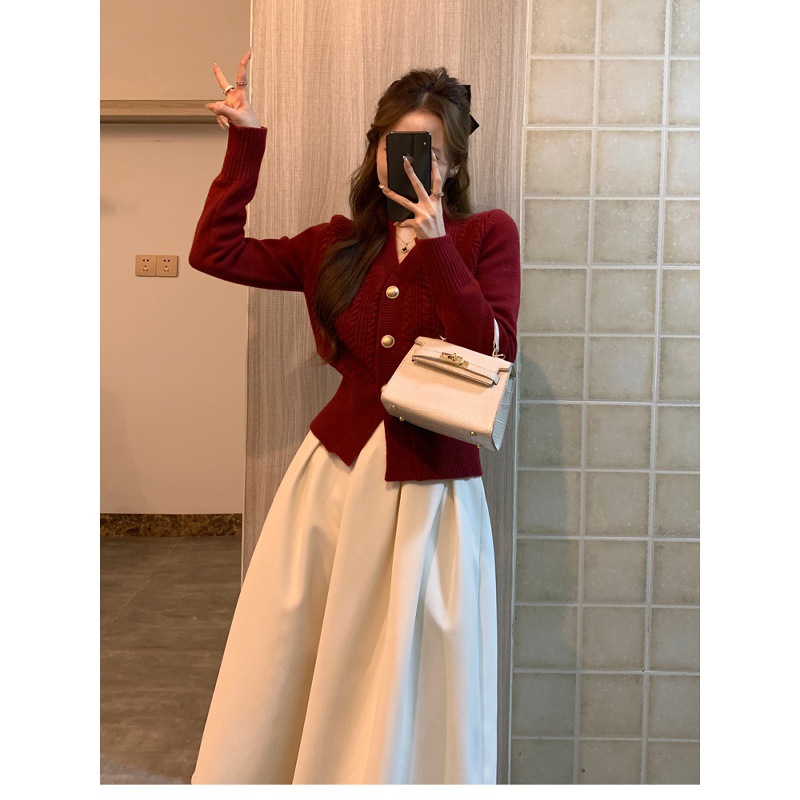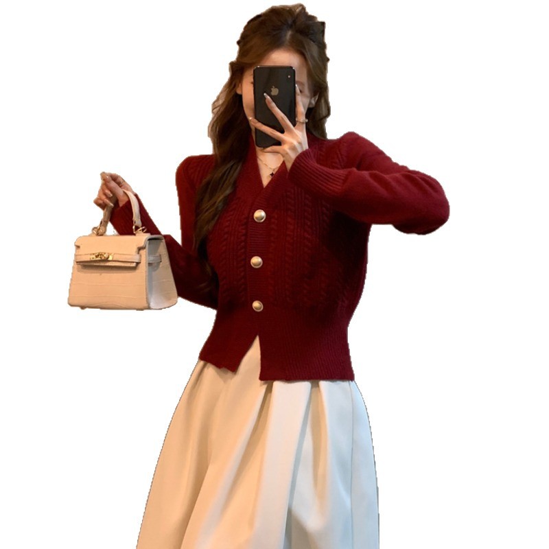 复古红色针织开衫女高级感麻花V领修身显瘦收腰毛衣外套内搭上衣