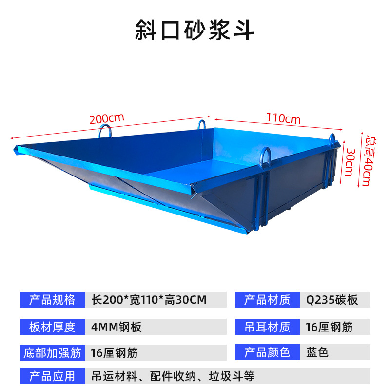 货号 | 斜口砂浆斗 | | 型号 | 斜口砂浆斗(长200*宽110*高30CM) |