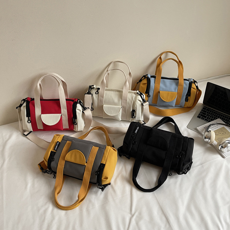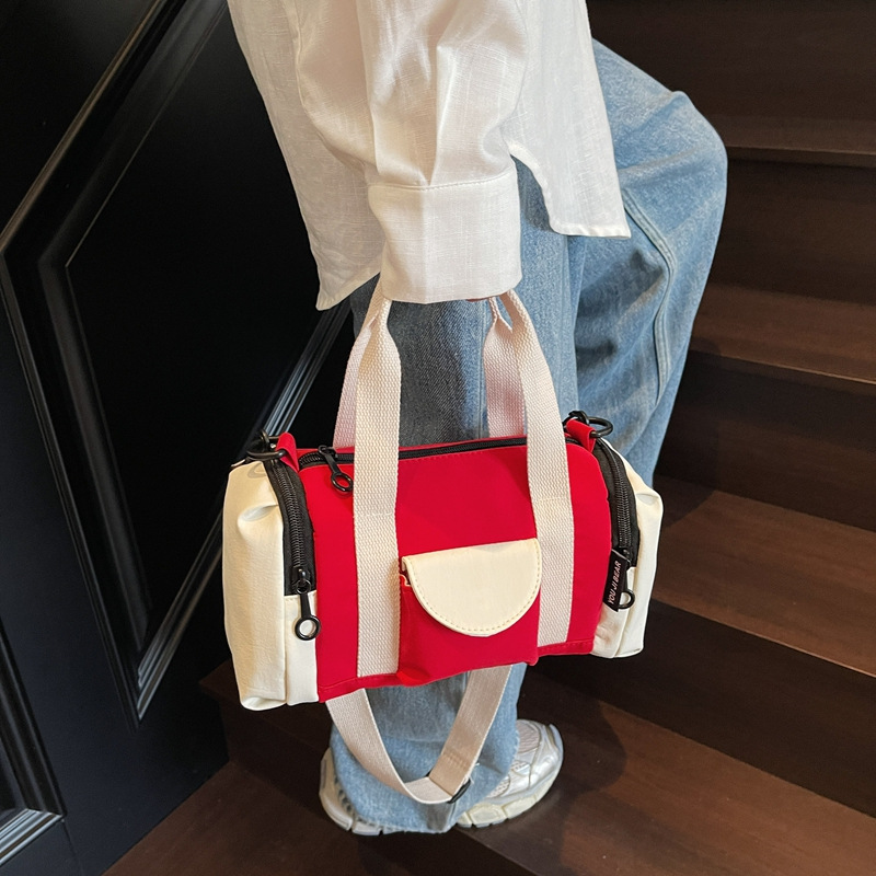 小众百搭撞色单肩斜挎包透气简约复古休闲枕头包大容量圆筒手提包