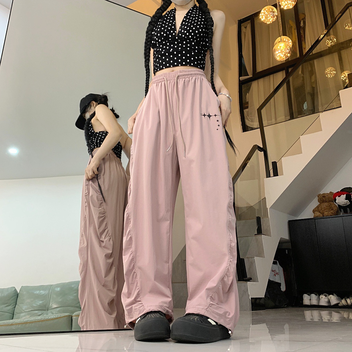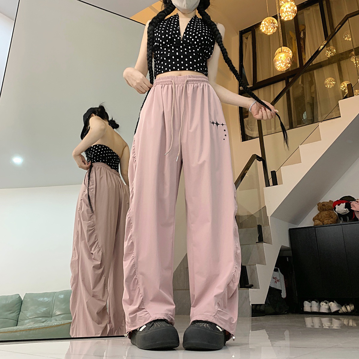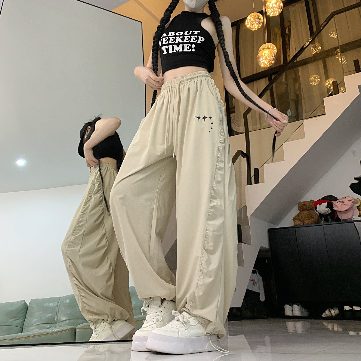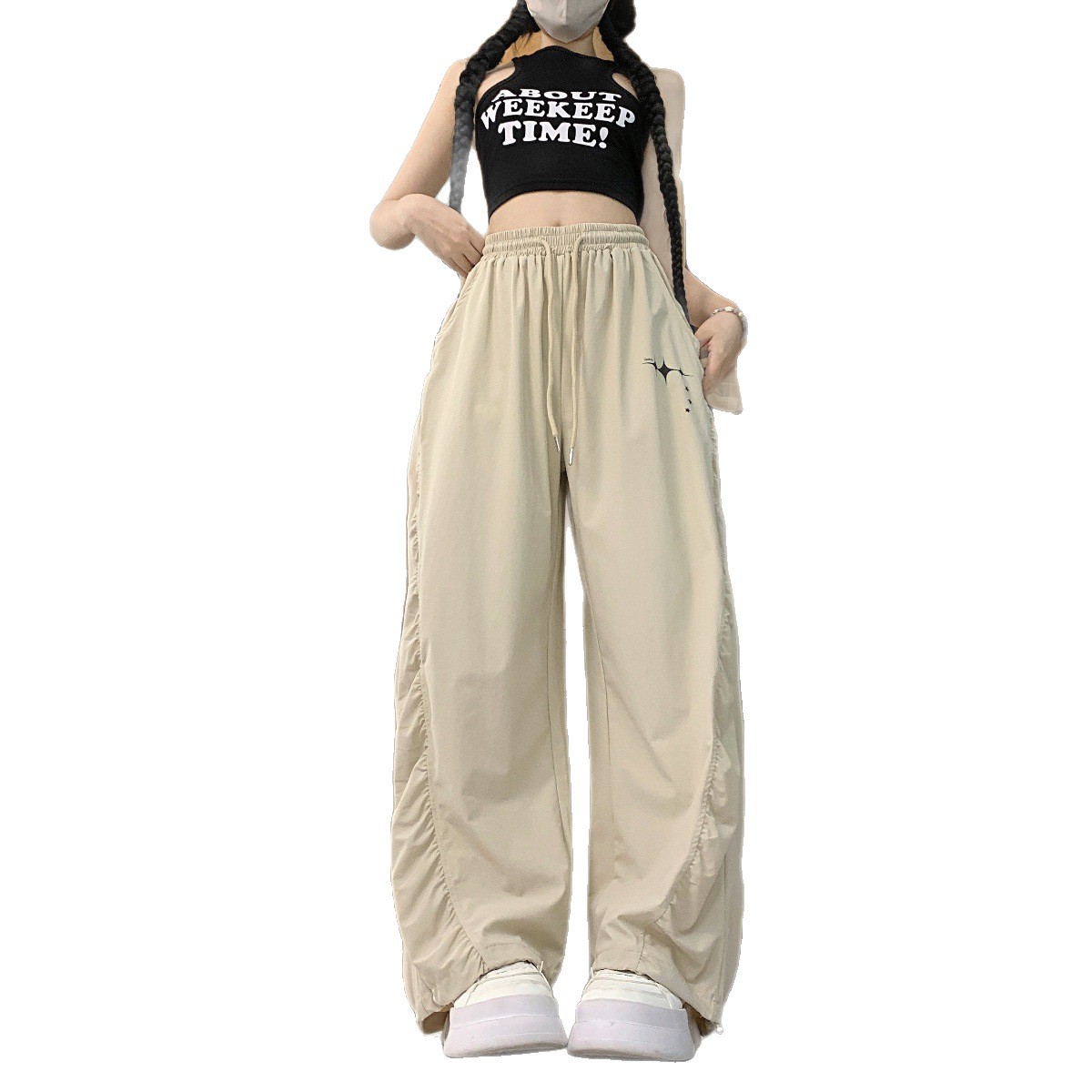 街舞潮牌静音速干工装裤夏季超薄褶皱抽绳运动直筒休闲裤