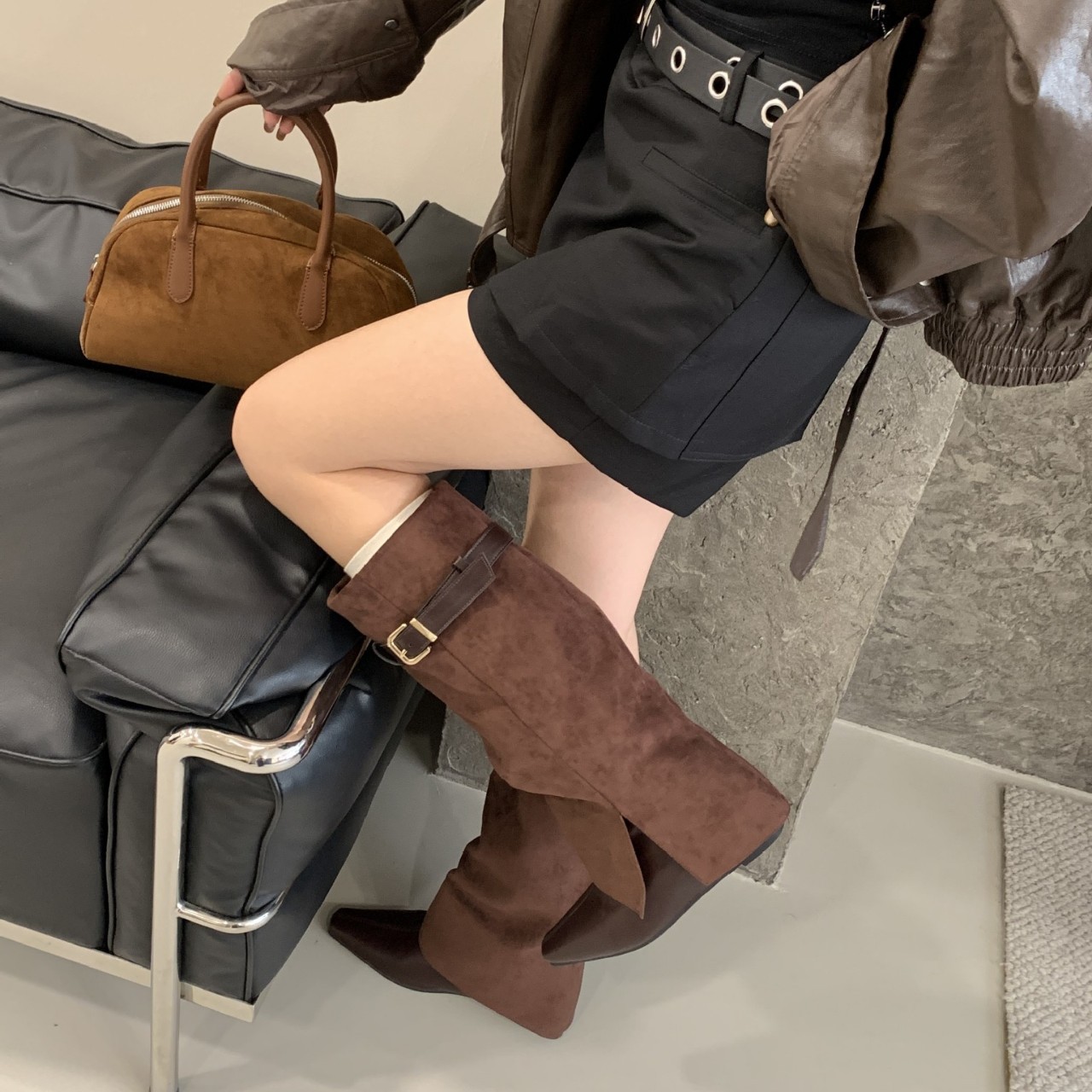 2025年秋冬季欧美时尚坡跟拼色西部靴不过膝长靴小方头绒面高筒靴
