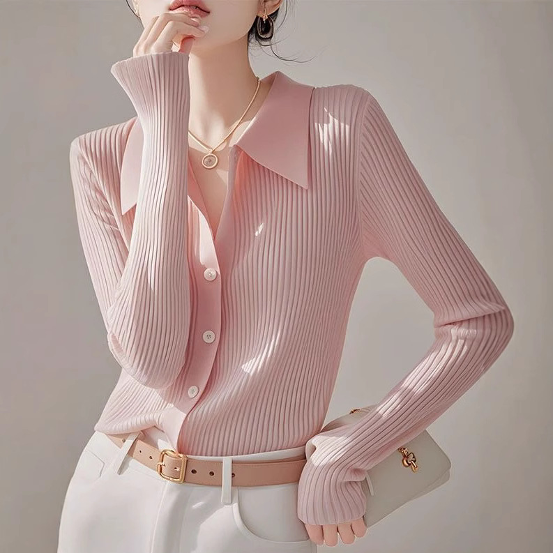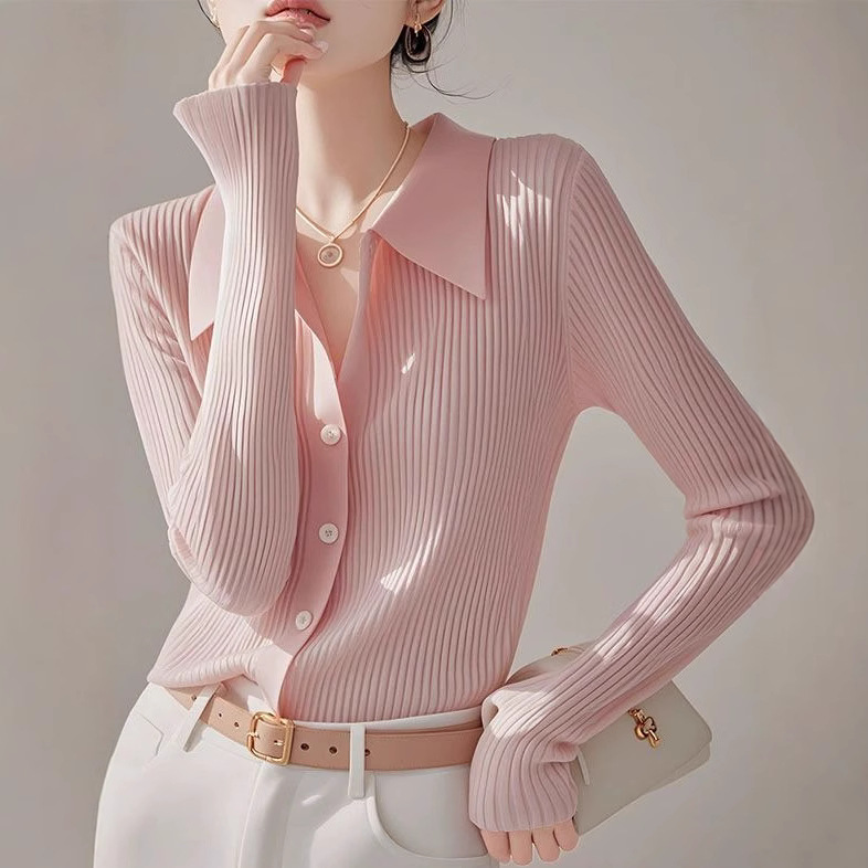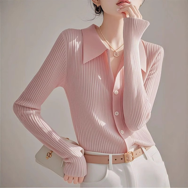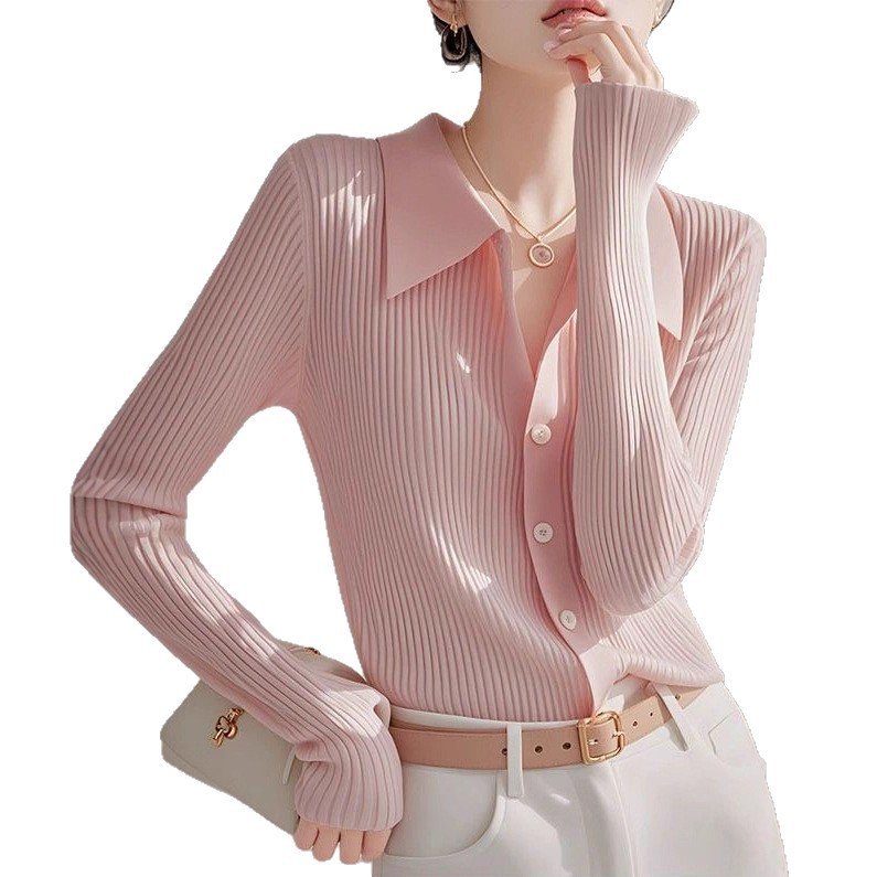 粉色长袖针织衫早秋新款气质polo领薄款宽松开衫外套超级好看上衣
