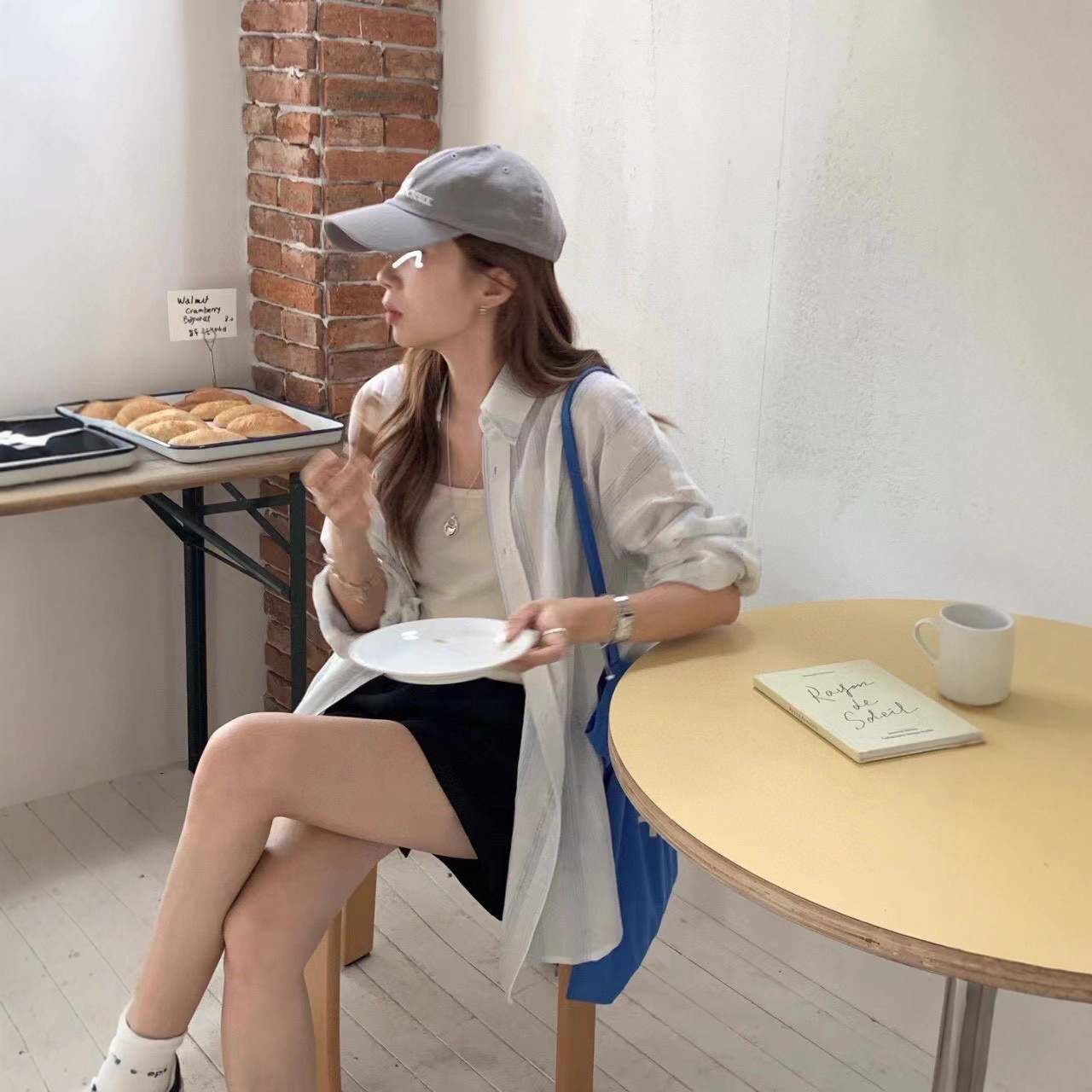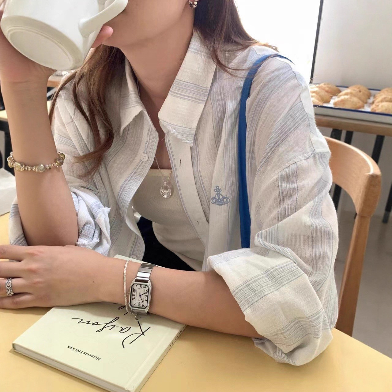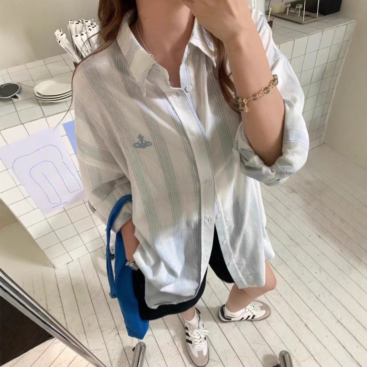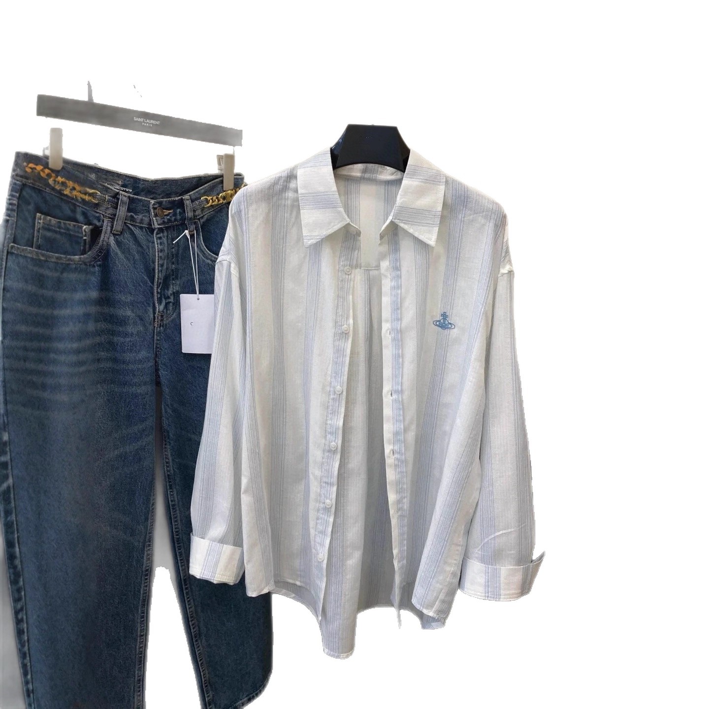 VIVI西太太现货小土星刺绣竖条纹防晒衬衫中长款宽松长袖外搭衬衣