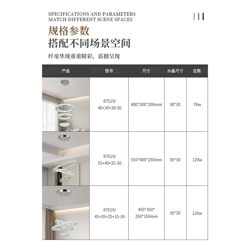 灯光颜色 | 87519无极调光/直径70+50+30cm | | 灯光颜色 | 87519无极调光/直径-80+60+40cm |
