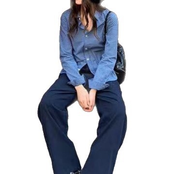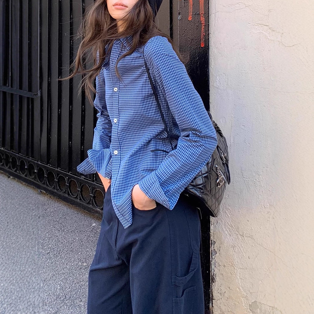 Miu式叠穿上衣棉经典蓝白格纹衬衫女四季穿搭百搭长袖衬衣