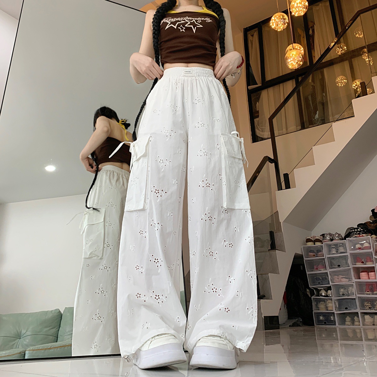 韩系温柔镂空绣花绑带工装裤女夏季松紧腰直筒束脚两穿休闲裤