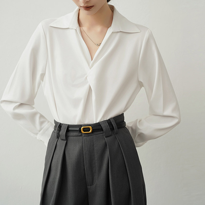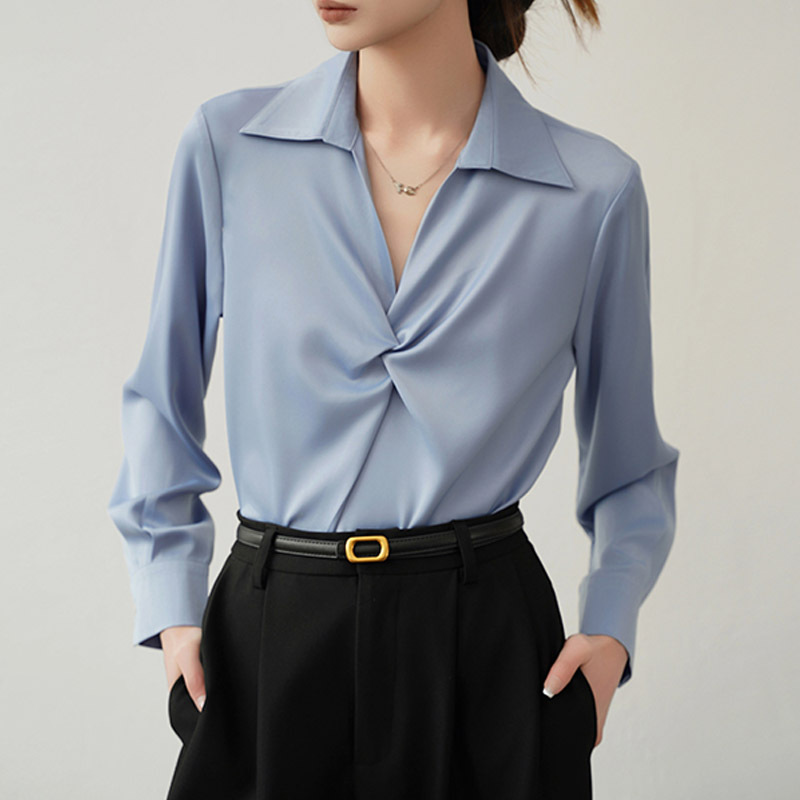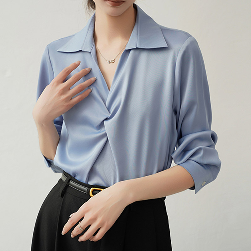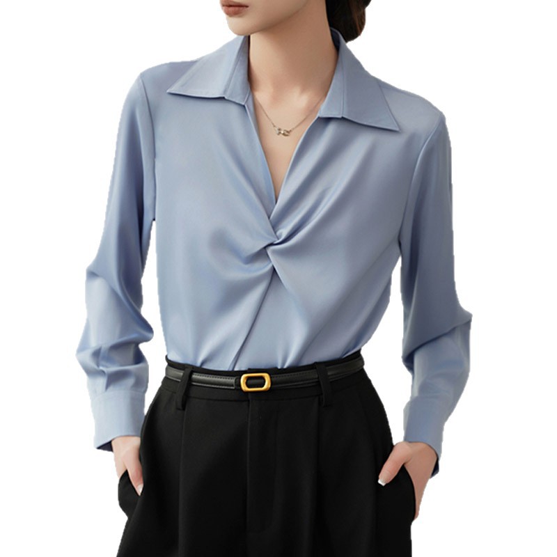 一见倾心 蓝色V领缎面衬衫女职业衬衣高知通勤穿搭职场上衣